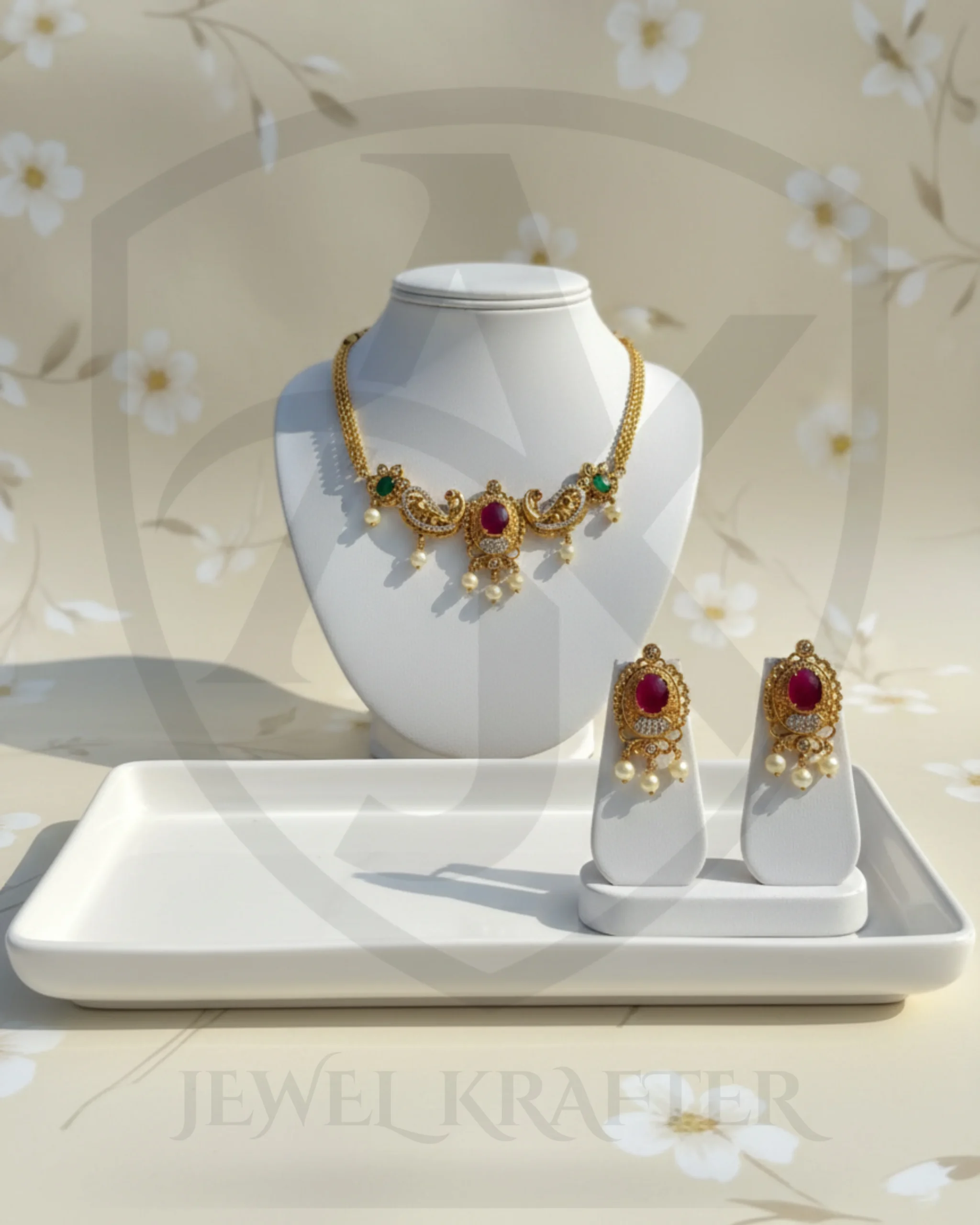 Intricate antique work and bold red stones make it perfect for mehndi, mayoun and barat looks. This heritage-inspired set beautifully pairs with sarees, lehengas and formal suits.
