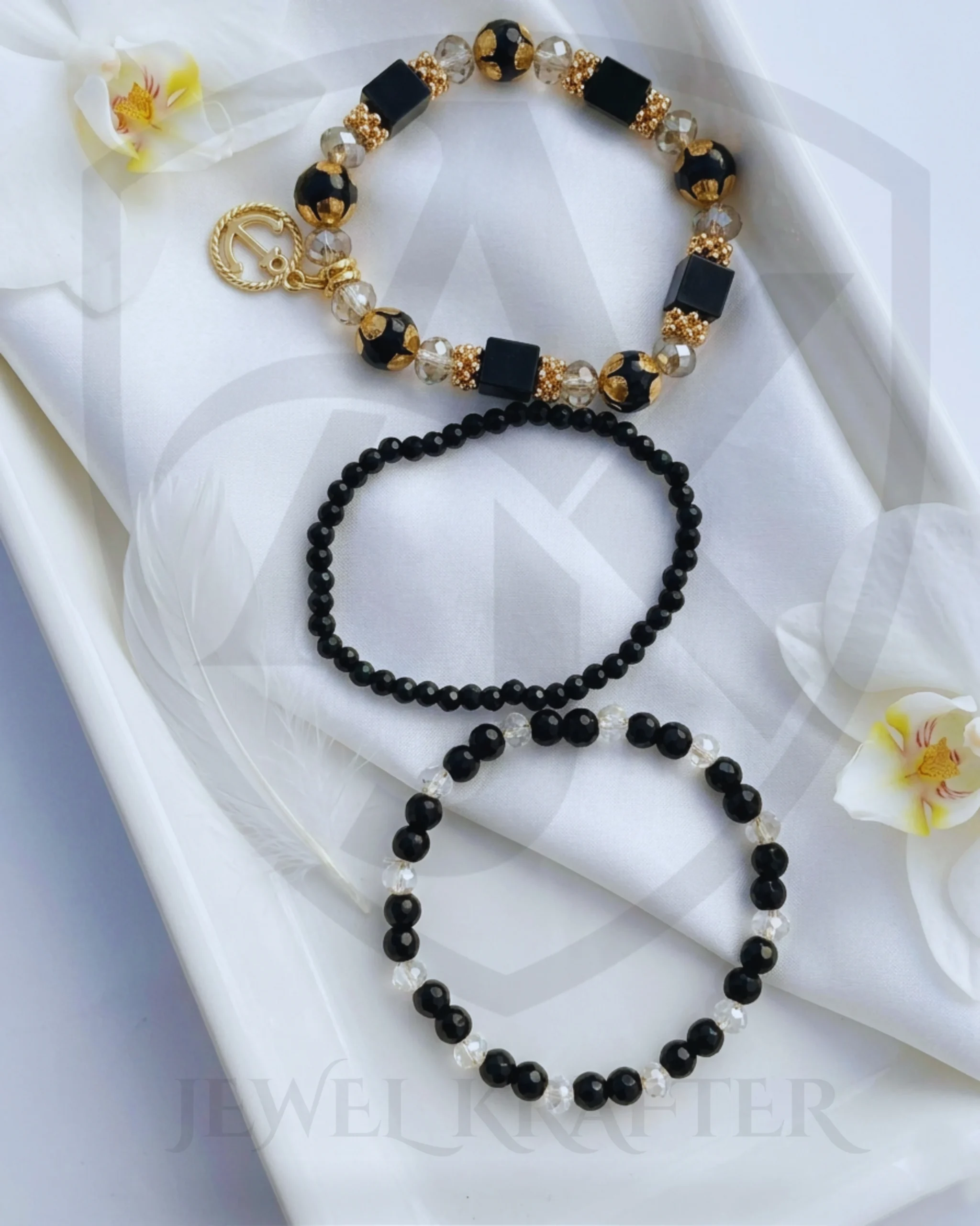 This coordinated trio includes a luxe black and gold beaded bracelet, a sleek plain black strand, and a black and clear crystal mix, offering multiple styling options in one chic set.