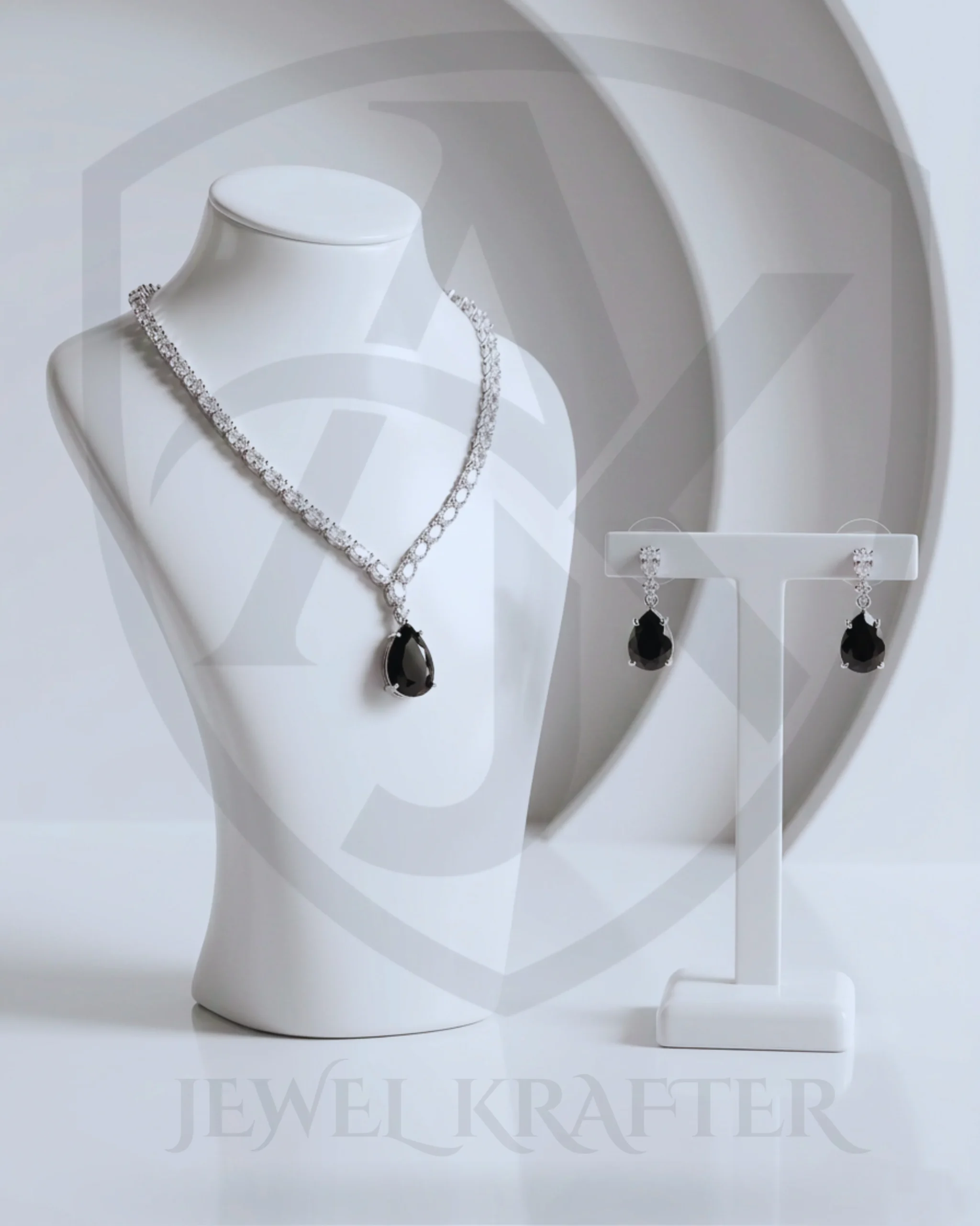 Glossy black stones framed by shimmering crystals mimic the allure of black diamonds. The necklace and earrings together bring chic, modern luxury to gowns and cocktail dresses.
