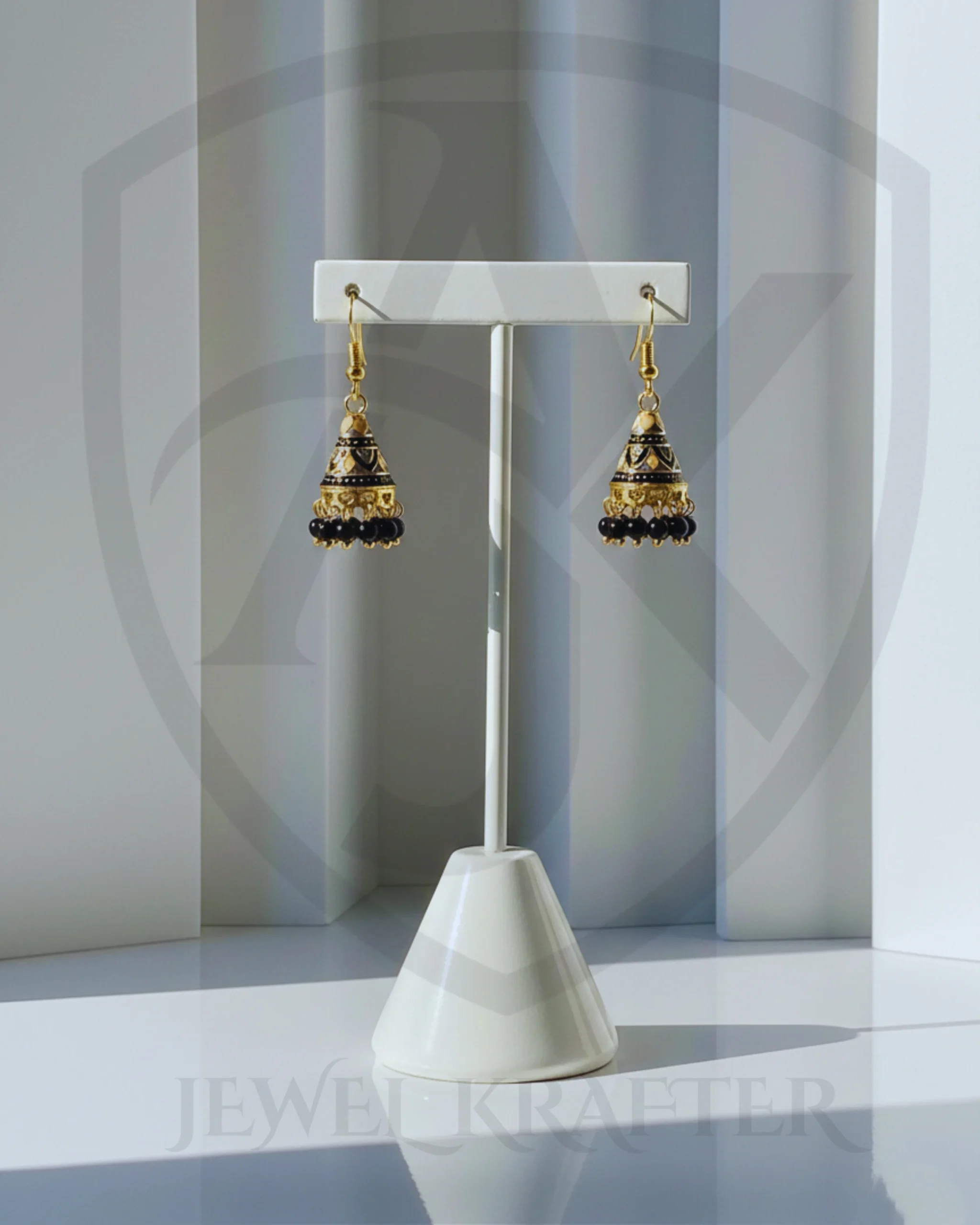 Elegant cone‑shaped jhumkas in rich black and gold detailing, finished with a fringe of glossy black beads for a bold festive look.