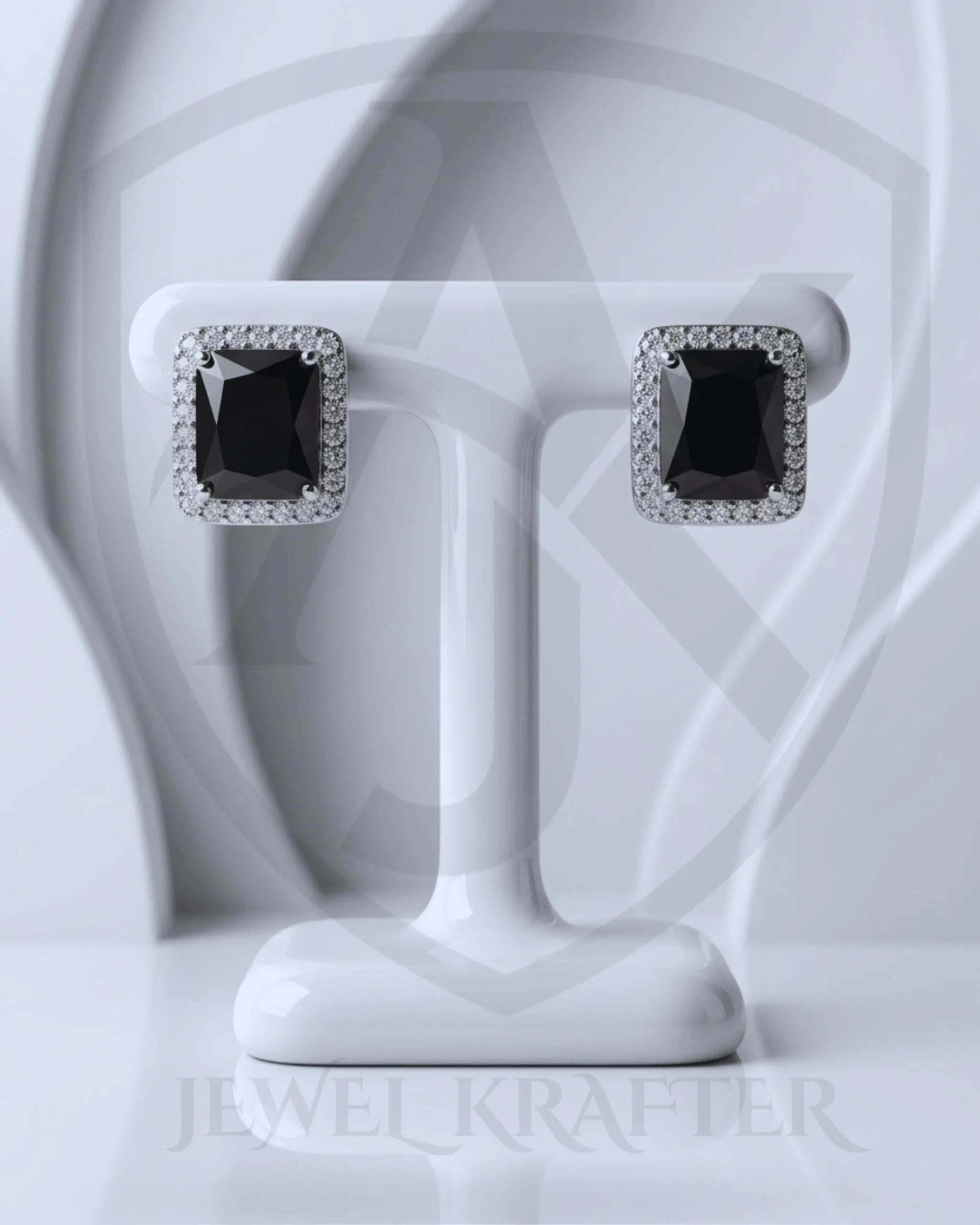 Sleek cushion cut black centers in a sparkling silver halo, designed to complement formal wear, evening gowns, and party outfits.