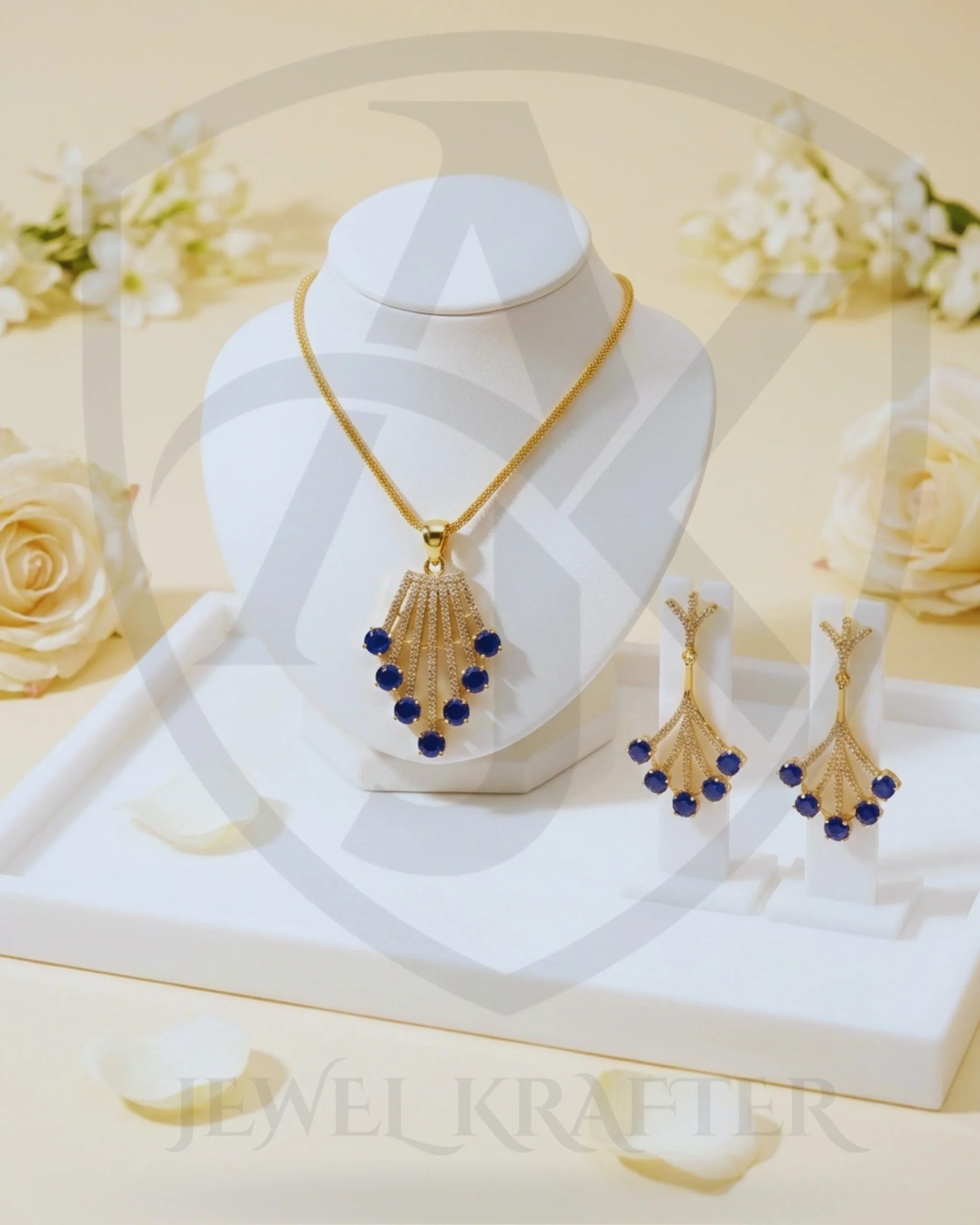 Inspired by flowing lights in the night sky, this set combines sleek gold lines with brilliant blue stones for a modern yet timeless look. A beautiful pick for mehndi, nikkah, or cocktail events.
