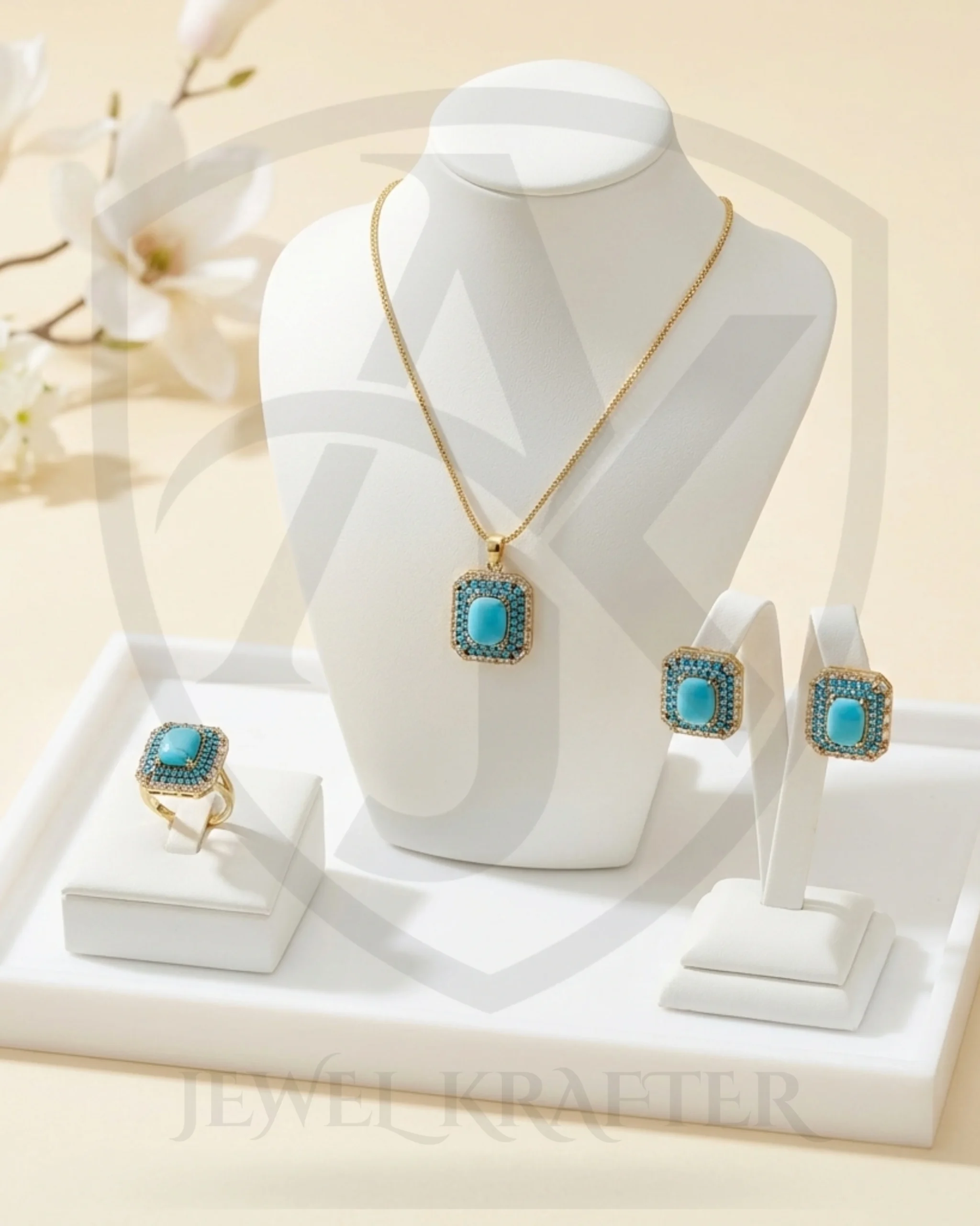 Bold rectangular turquoise stones with delicate crystal borders add a pop of color to both casual and formal outfits.