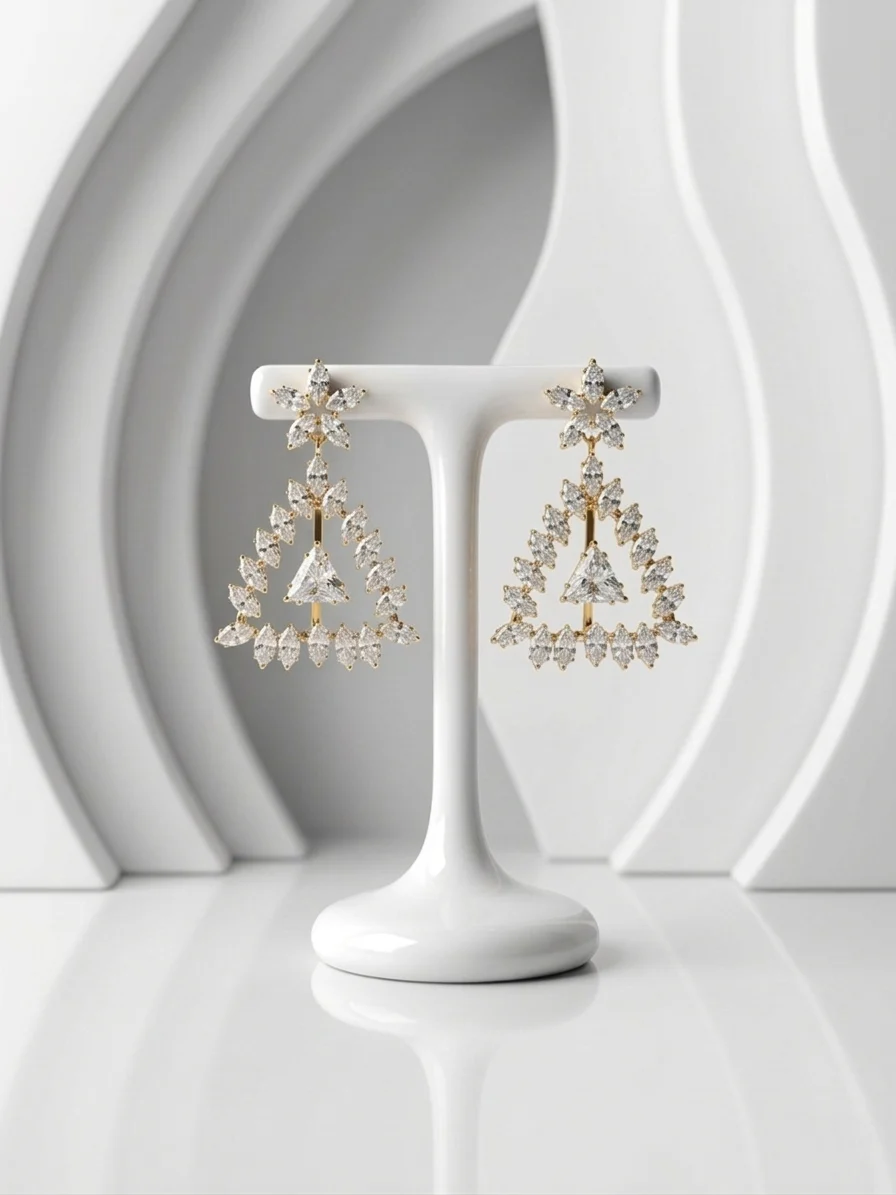 Radiant triangular chandeliers, drenched in shimmering marquise stones, cascade from a starburst stud for a truly celestial, red carpet look.