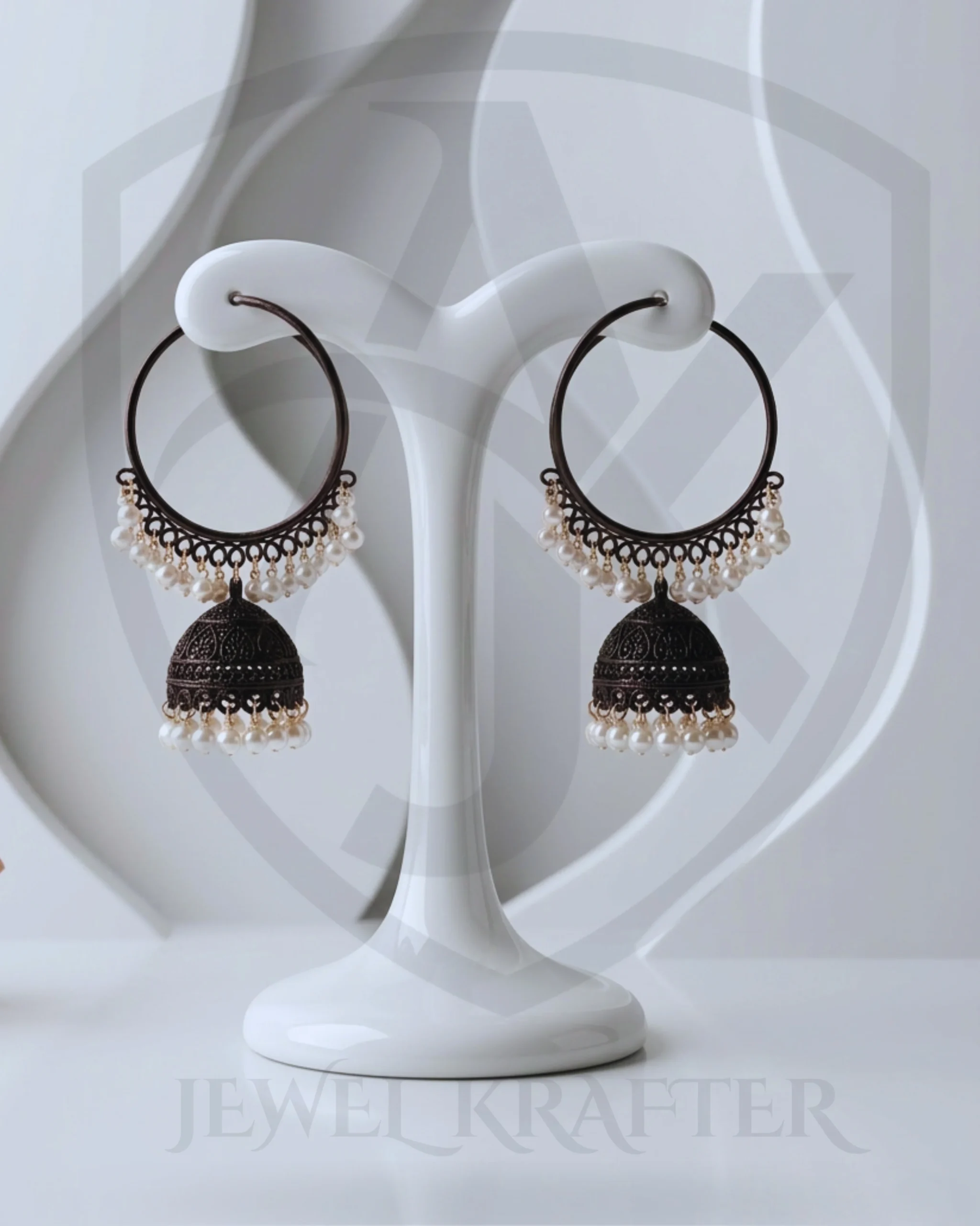 Elegant dark brown oxidized metal hoops hold intricately carved dome jhumkas, finished with a delicate fringe of soft ivory pearls for a refined, heritage look.