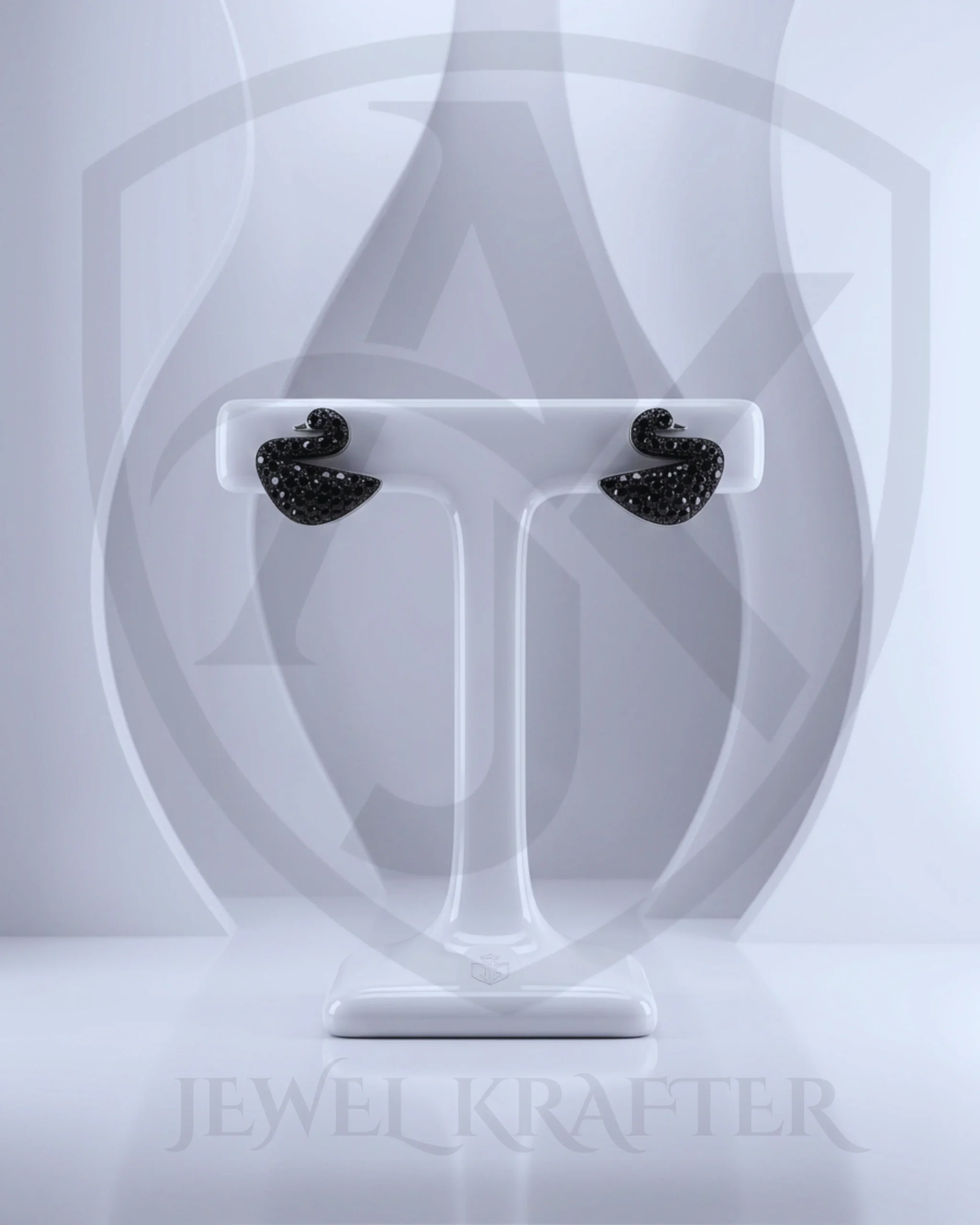 Lightweight swan shaped studs with glossy dark crystals, bringing refined drama to both casual and evening outfits.