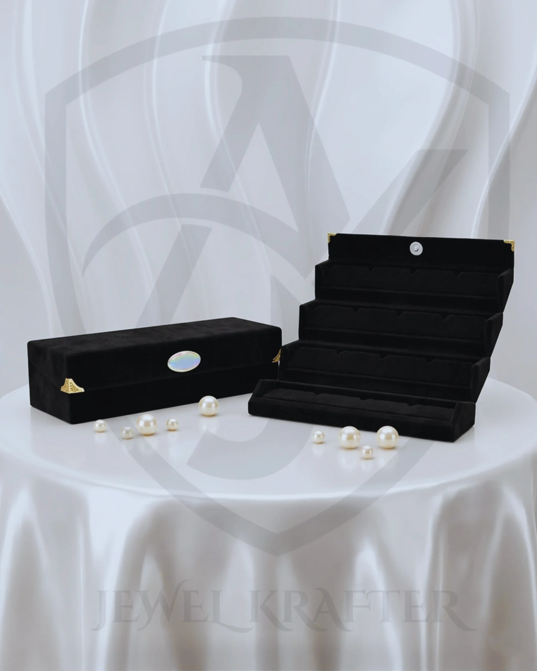 Elegant black velvet Jhumka box with step style tiers, perfect for neatly arranging and protecting multiple pairs of Jhumkas.
