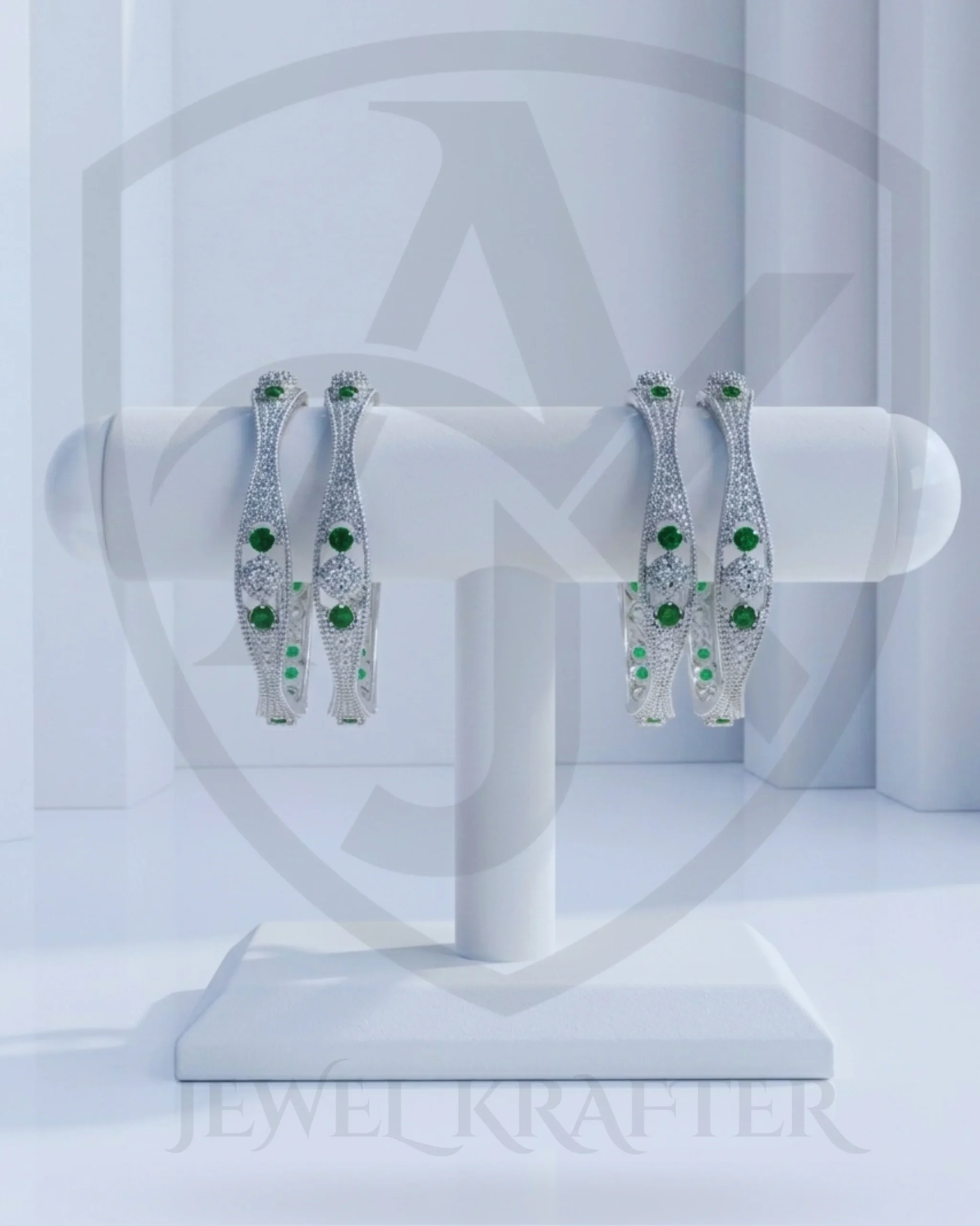A breathtaking pair of bangles featuring a sleek sculptural silhouette, fully adorned with shimmering micro set stones and vibrant emerald green center gems.