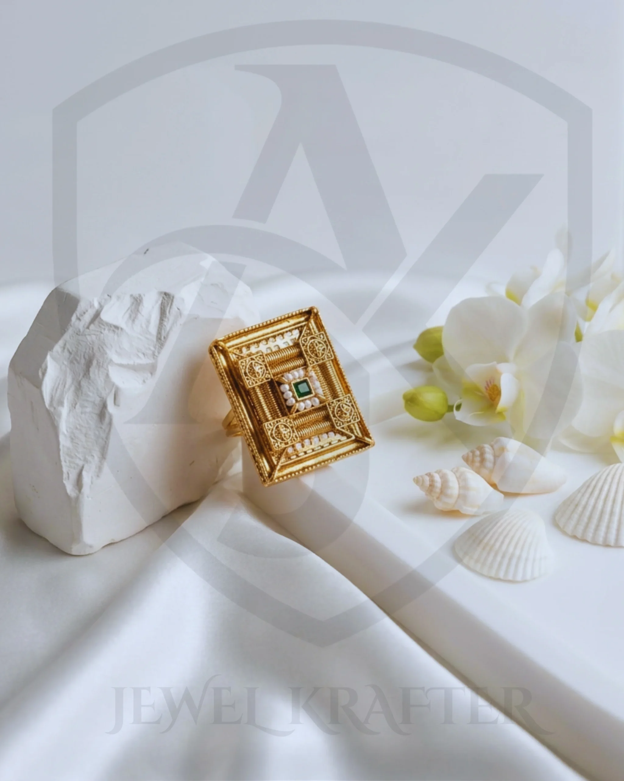 A tall rectangular ring inspired by vintage haveli doors, featuring rich gold detailing, miniature wheel motifs and a striking green center stone framed with delicate white beads. Perfect for weddings and festive occasions.
