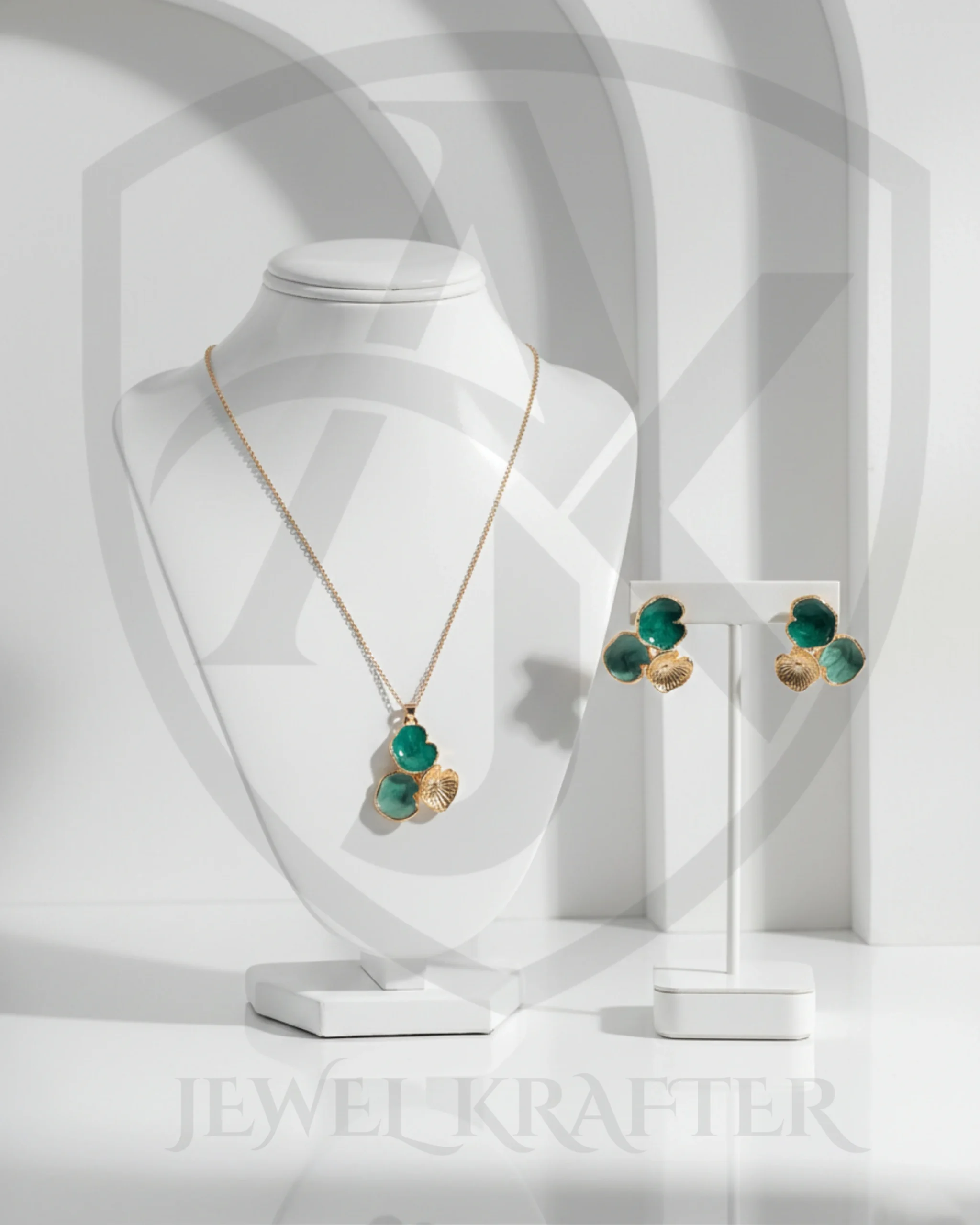 A graceful jewelry set featuring clover shaped green stones framed in warm gold tones. The matching pendant and earrings bring a soft floral elegance, perfect for both everyday wear and special occasions.