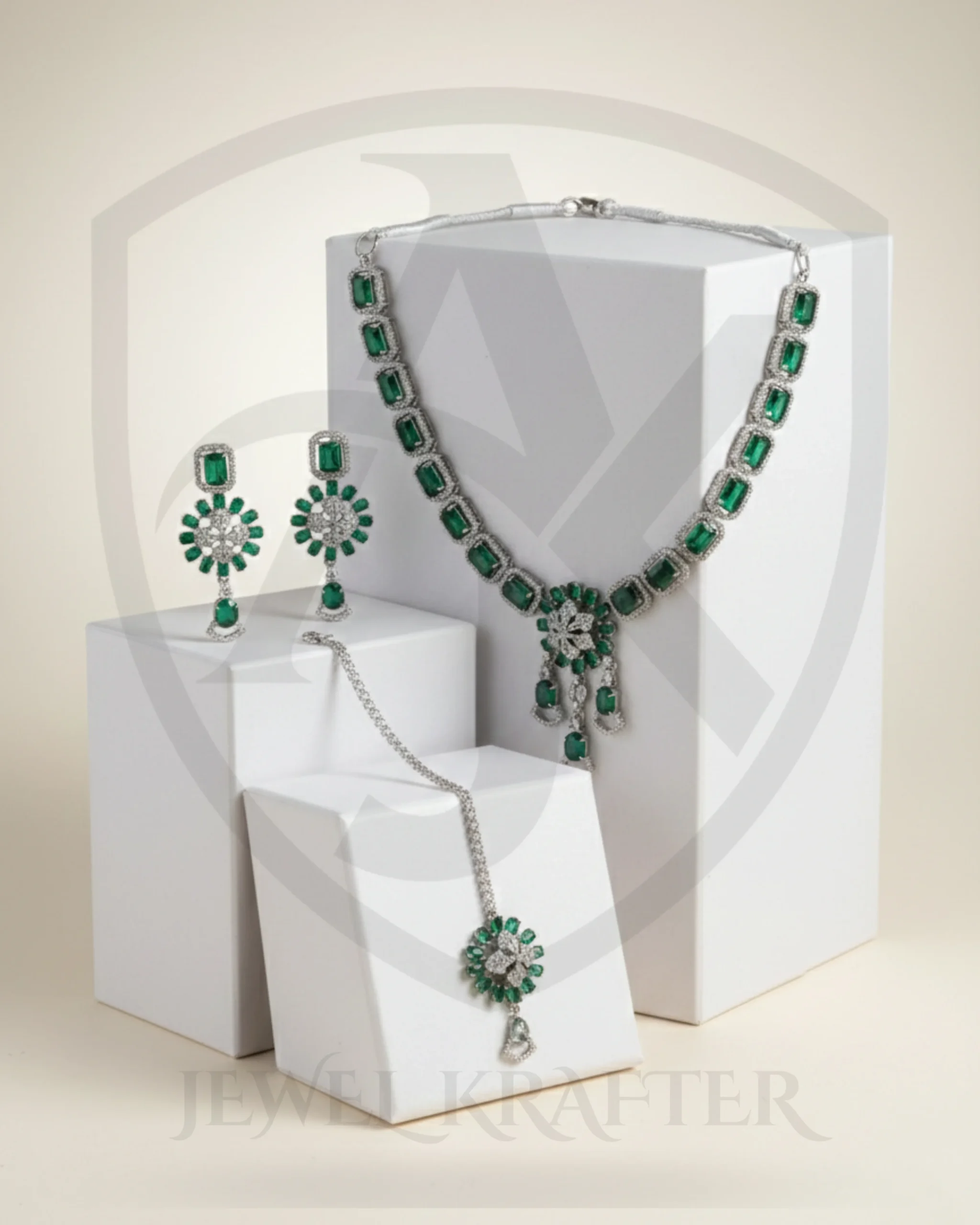 A regal emerald and crystal set featuring sunburst motifs that light up every special occasion. Perfect with sarees, maxis, or lehengas, this set turns any outfit into a show stopping ensemble.