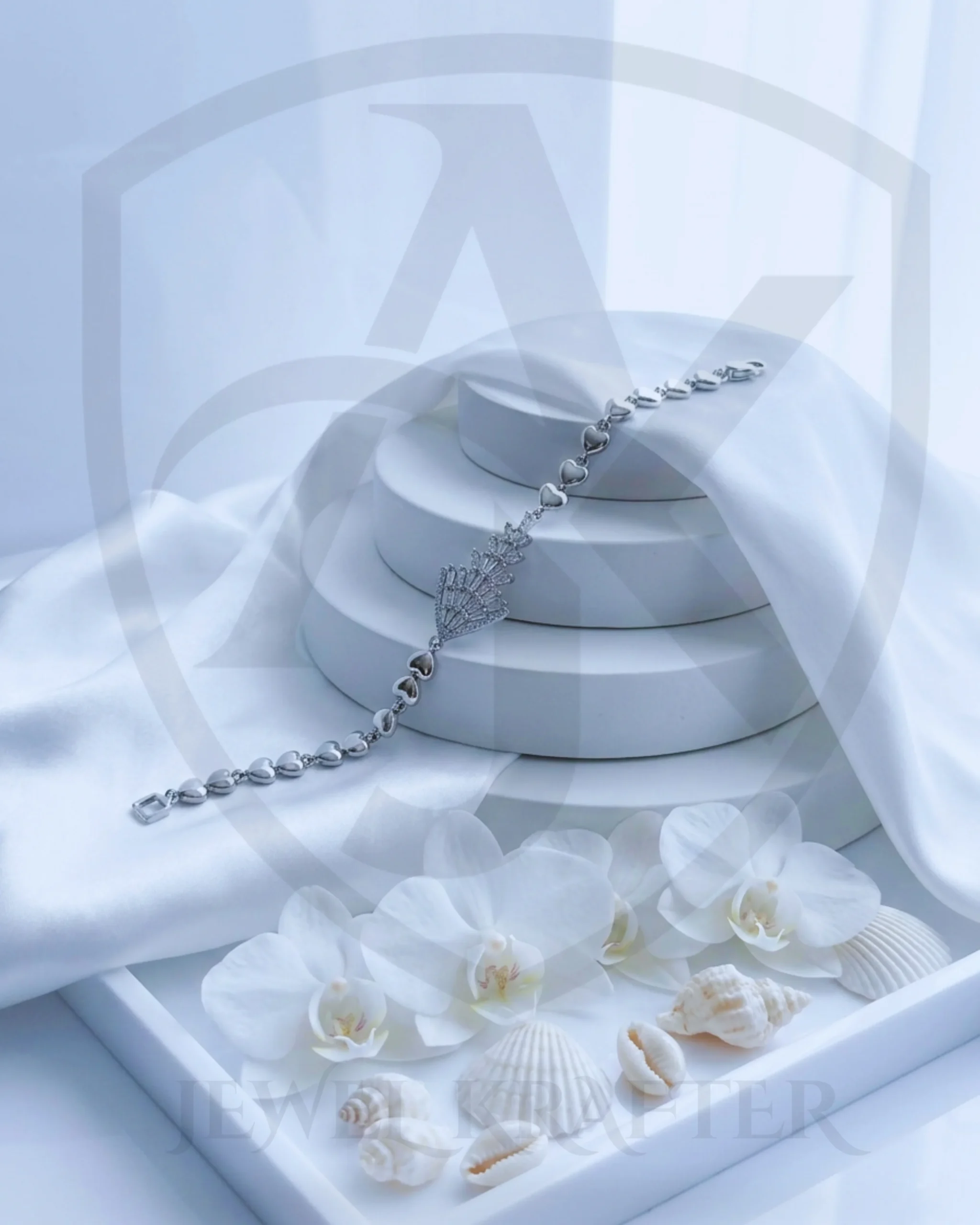 A delicate silver bracelet featuring a sparkling feather motif at the center, framed by dainty heart shaped links for a soft, romantic finish.
