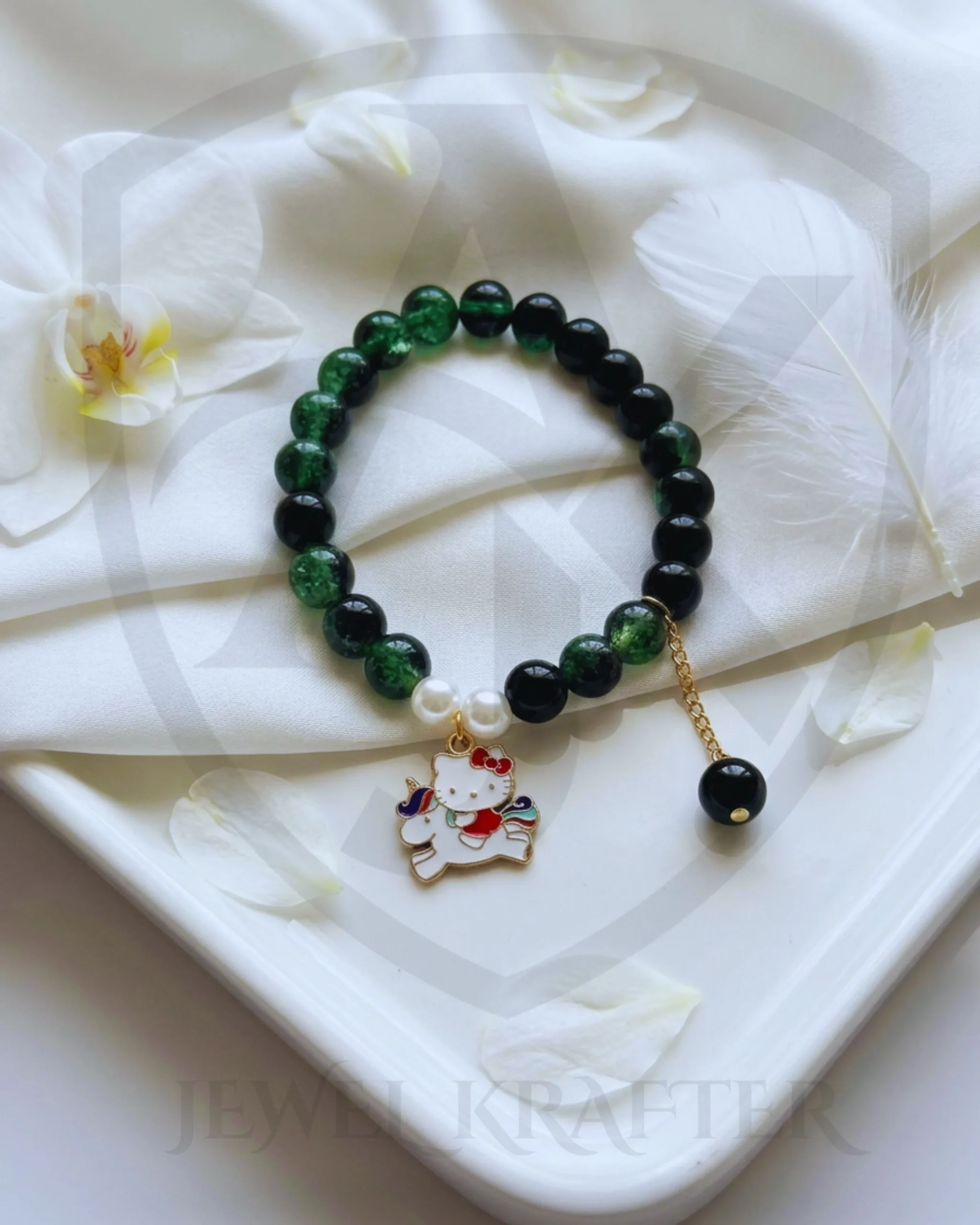 A whimsical kid’s bracelet with deep green and black beads, finished with two pearls and a colorful kitty on unicorn charm for a magical forest fairy vibe.