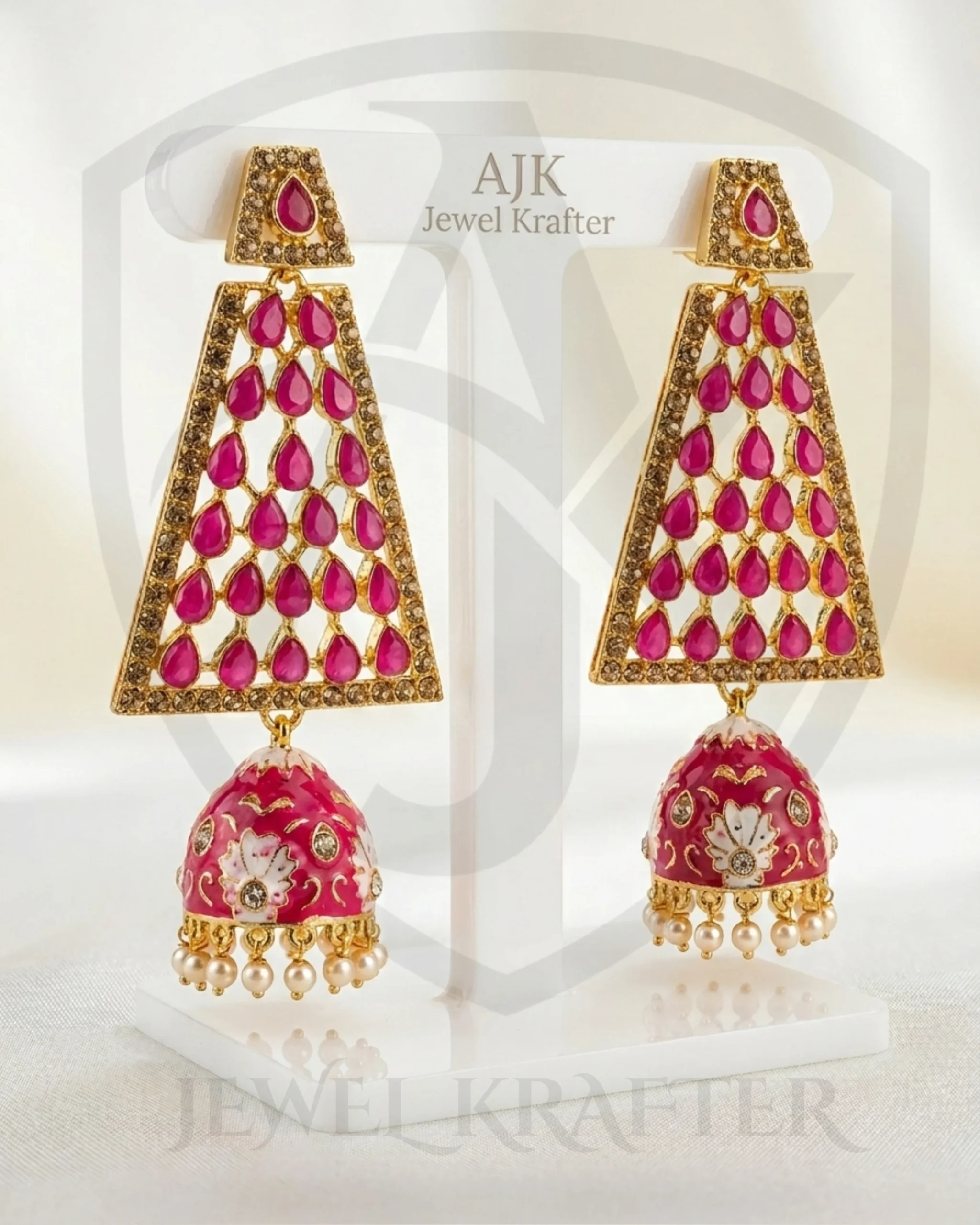 Long triangular tops studded with rich pink teardrop stones flow into enameled jhumkas, finished with tiny pearls for a vibrant, statement bridal look.