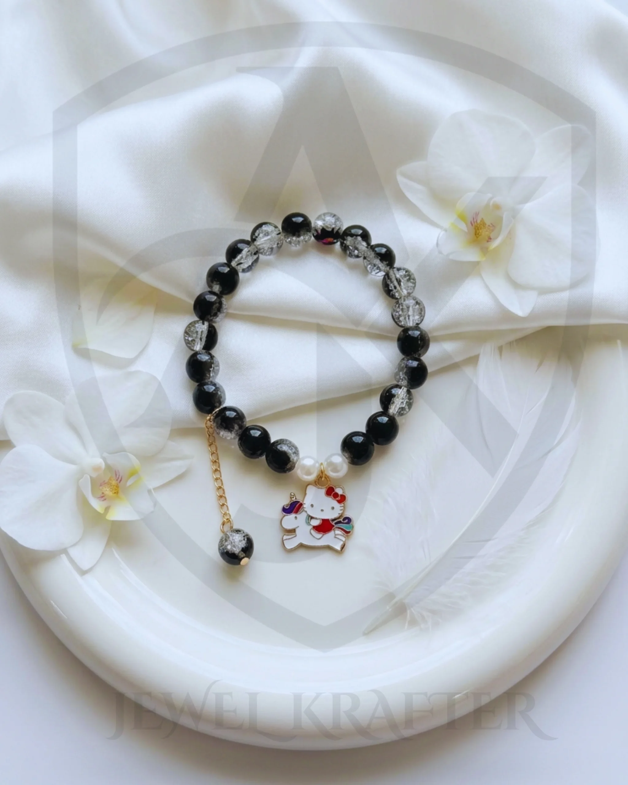 This stretch bracelet combines starry black and white beads with a dangling bead tassel and enamel unicorn kitty, perfect for little ones who love space and fantasy.