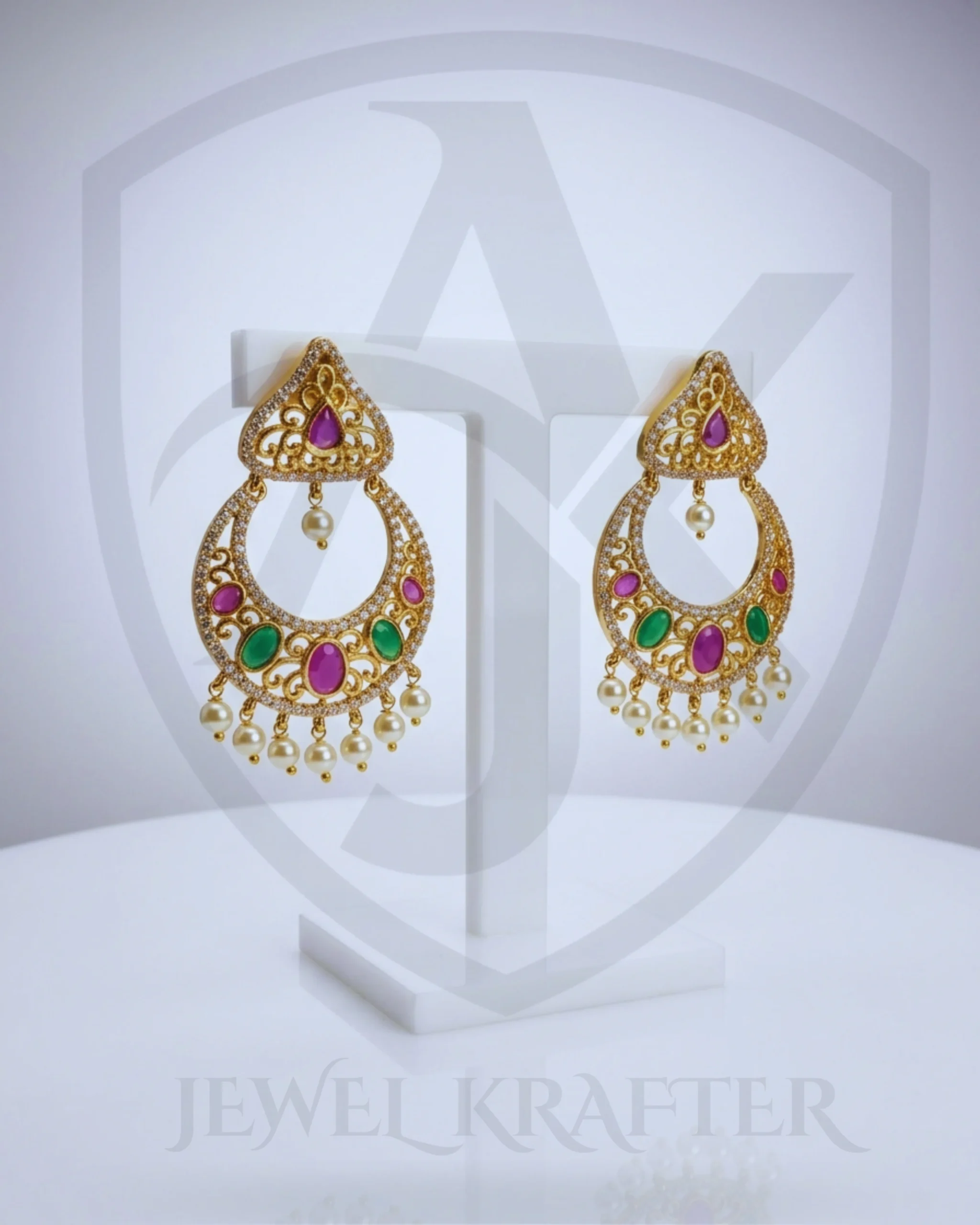 A modern twist on traditional chandbalis, designed with bright stones, delicate crystals, and dangling pearls that add instant glam to any occasion.
