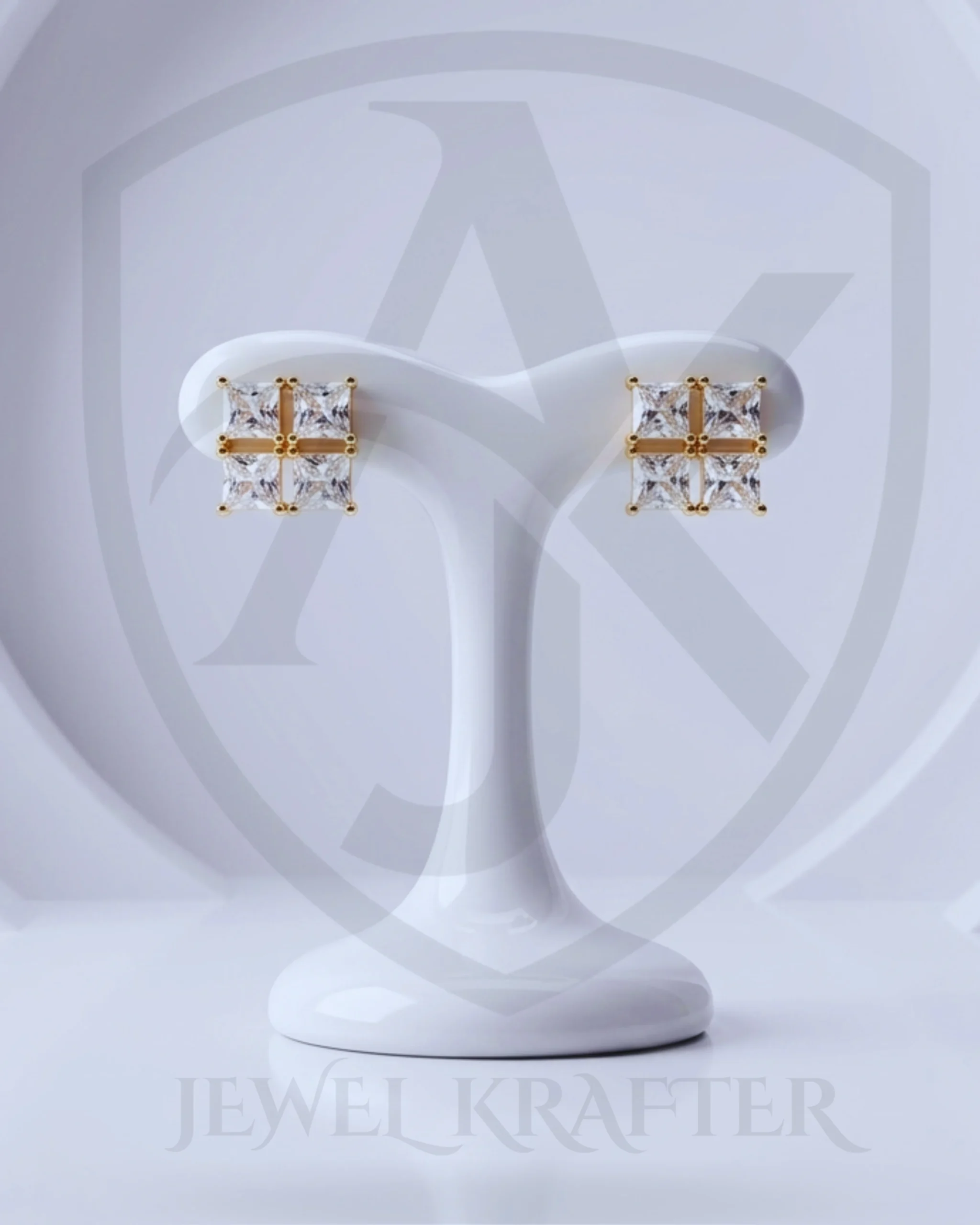 Dainty earrings designed with a gold cross grid holding clear square stones, creating a refined, modern look perfect for office or casual wear.