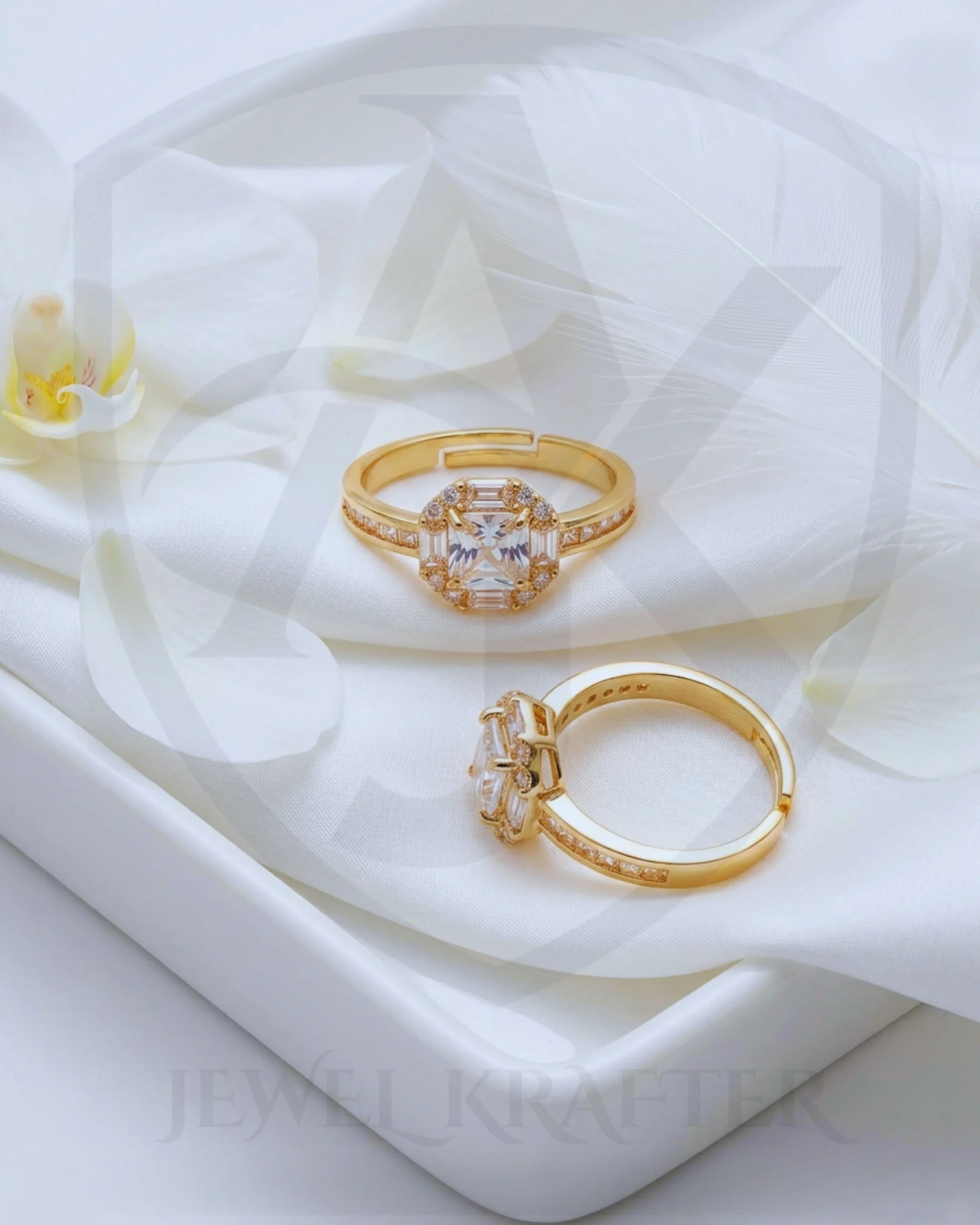 A dazzling emerald cut center stone is elegantly framed by a baguette and round crystal halo, set on a gold tone channel set band for a timeless and luxurious bridal look.