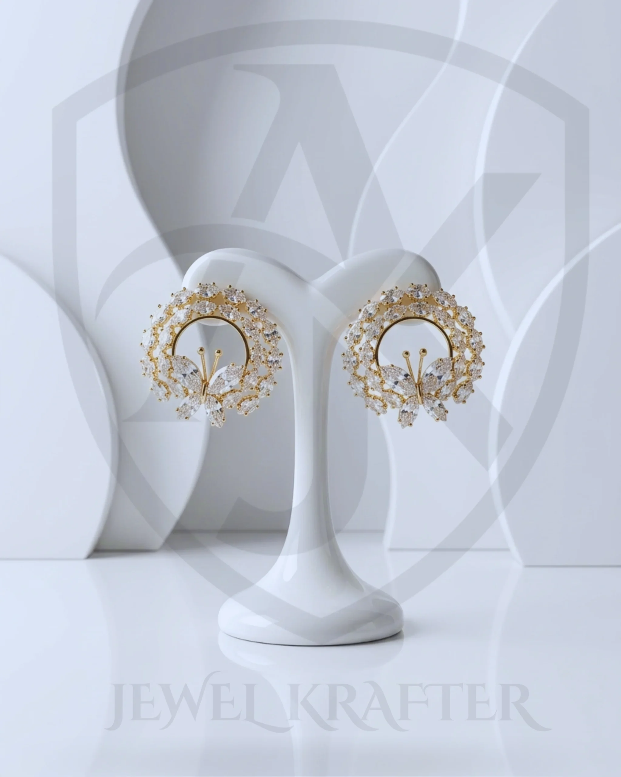 A radiant circular halo of sparkling stones frames a delicate butterfly motif in rich gold tone, creating an elegant statement stud for weddings and formal events.