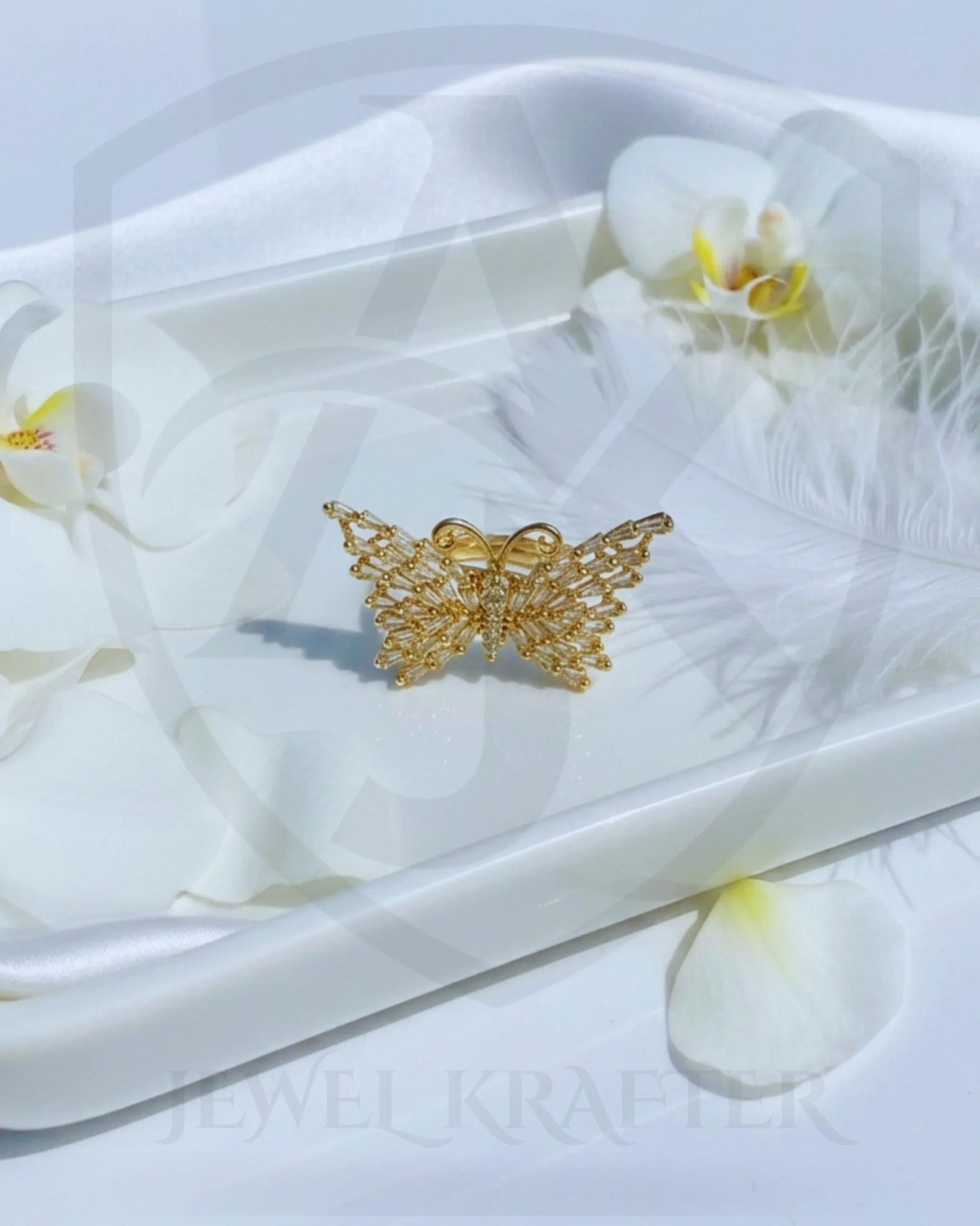 A radiant gold-tone butterfly cocktail ring adorned with meticulously set baguette crystals for an effortlessly glamorous look.