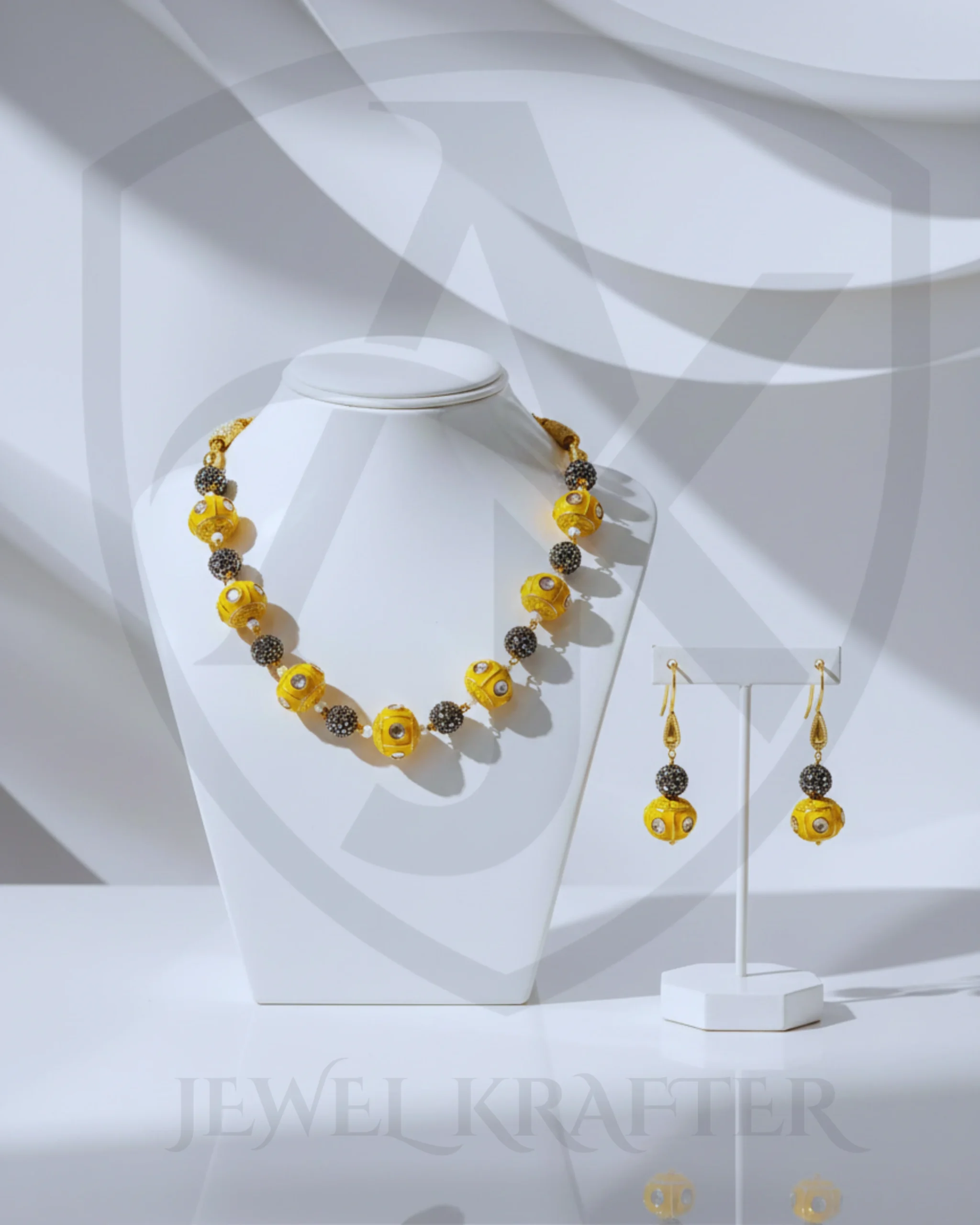 A vibrant beaded necklace and earrings set featuring rich mustard‑gold beads paired with textured black stones. Ideal for adding a festive pop of color to casual kurtis and semi formal wear.