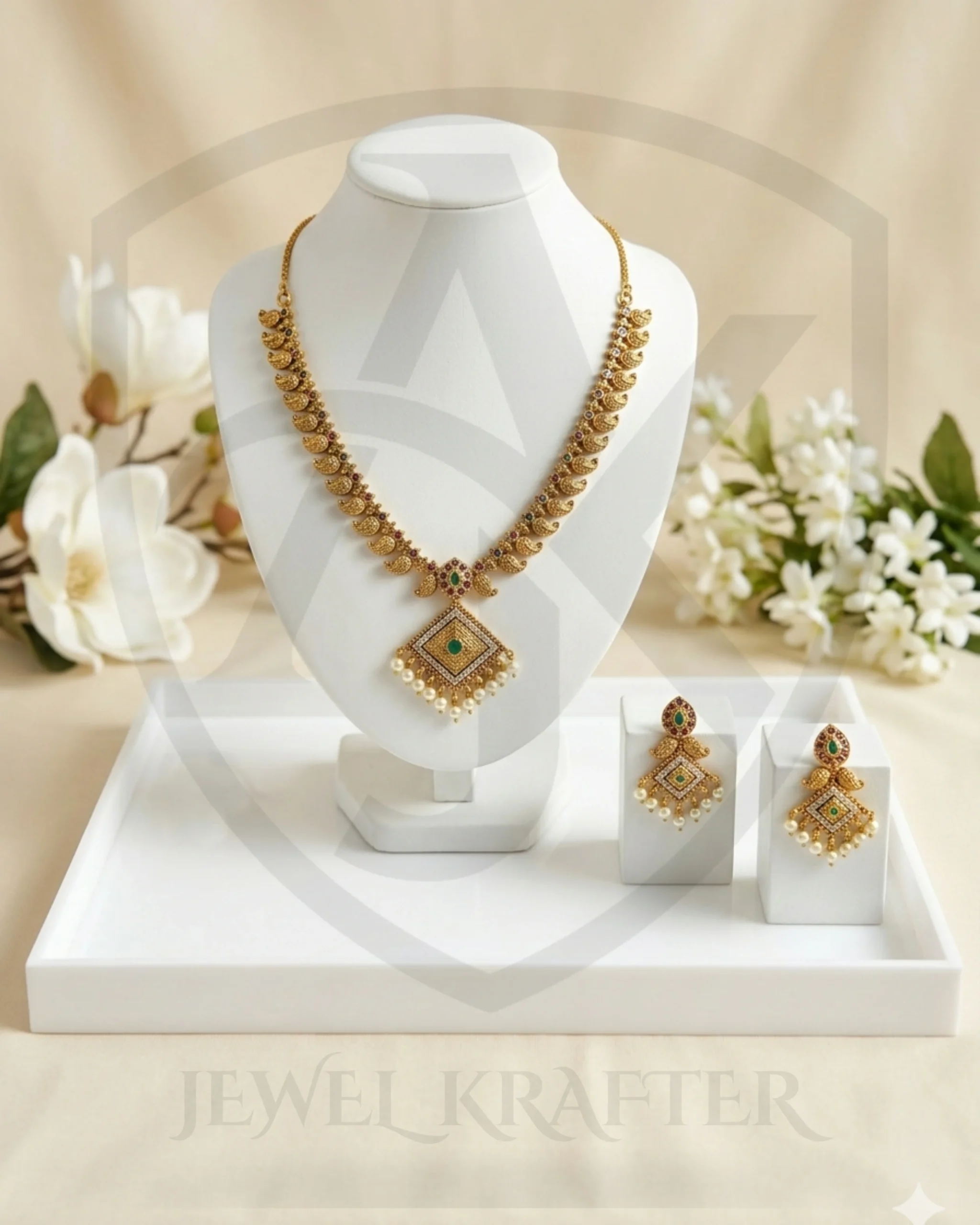 Delicate leaf motifs, colored stones, and cascading pearls create a rich, royal look for weddings and festive occasions.