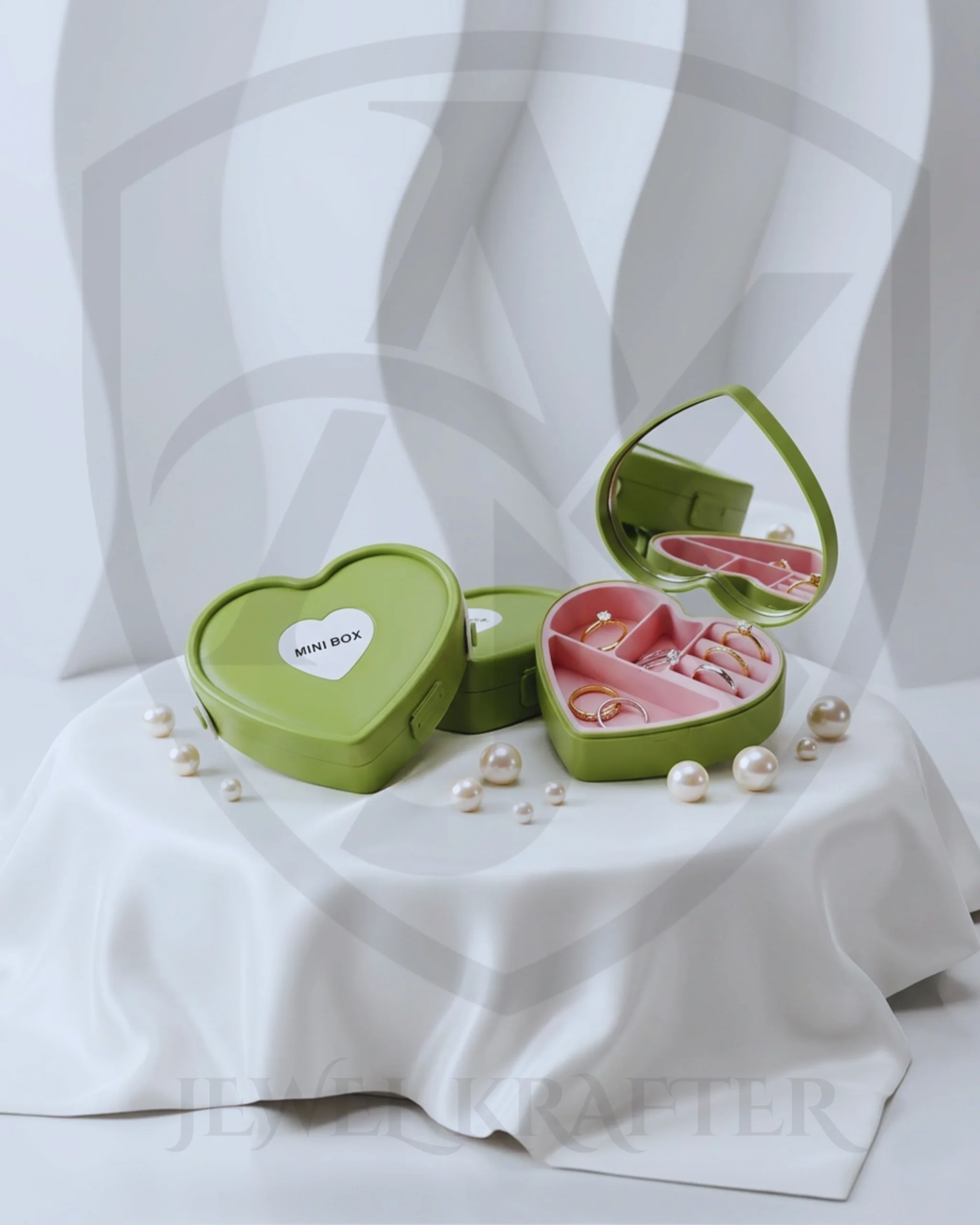 Cute green heart mini box with built in mirror and pink compartments, perfect for organizing rings, earrings, and small accessories.
