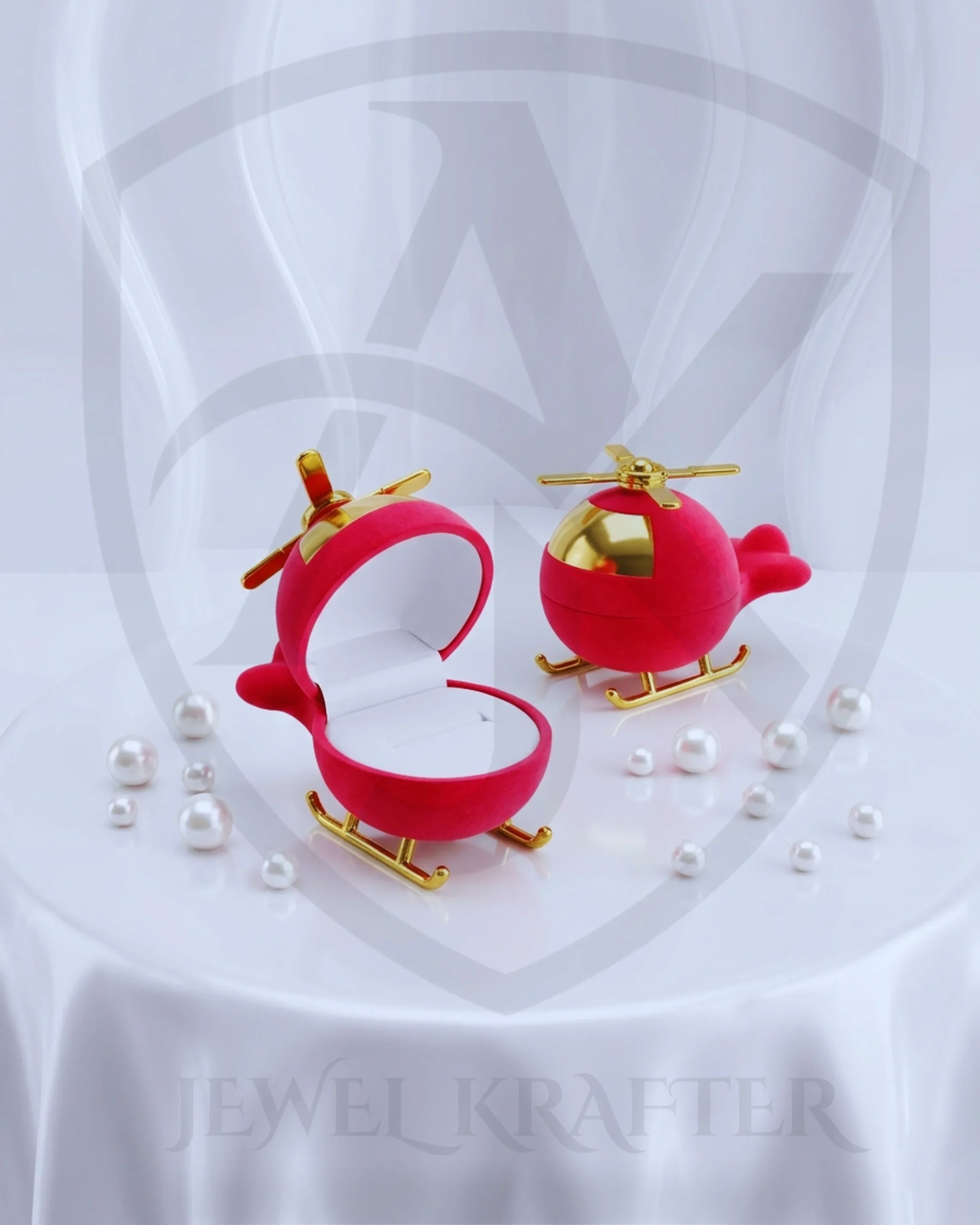 Fun and eye catching helicopter ring box in red velvet with golden details, perfect for playful proposals and unique ring gifting.