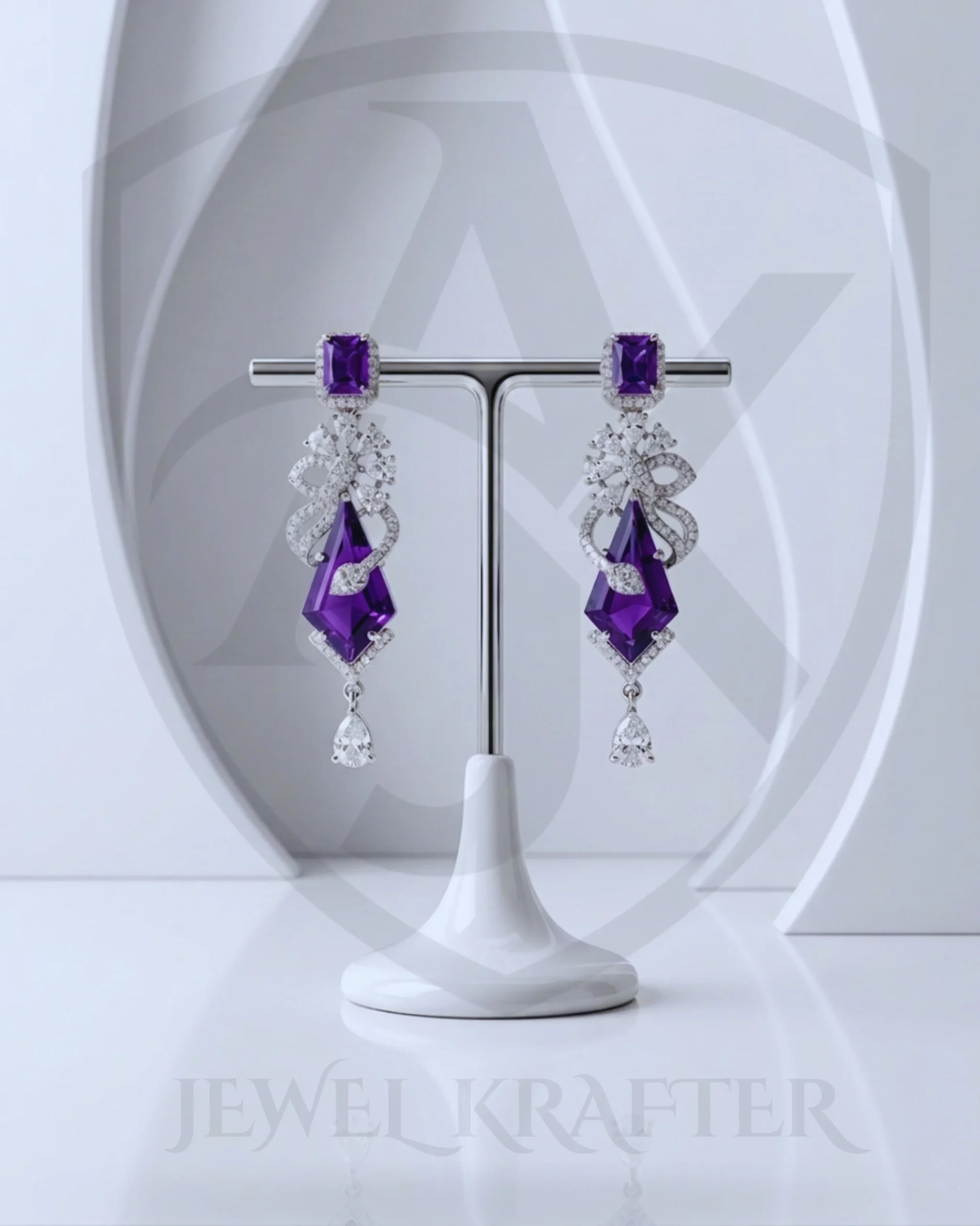 Faceted purple prisms are paired with intricate zircon encrusted motifs for a bold yet refined look. Ideal for weddings, engagement parties and high glam events.