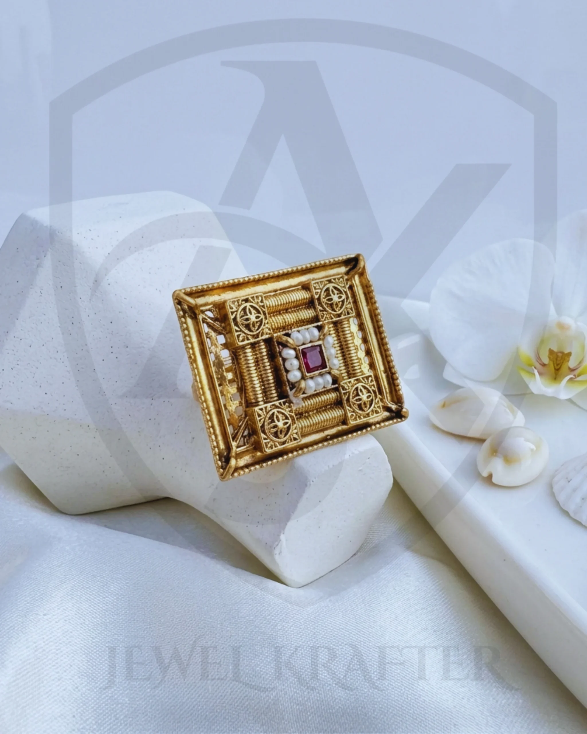 A bold, architectural square ring crafted in antique gold tones, featuring intricate wirework, floral motifs and a central ruby red stone framed by tiny white beads. Perfect for brides and statement jewelry lovers.