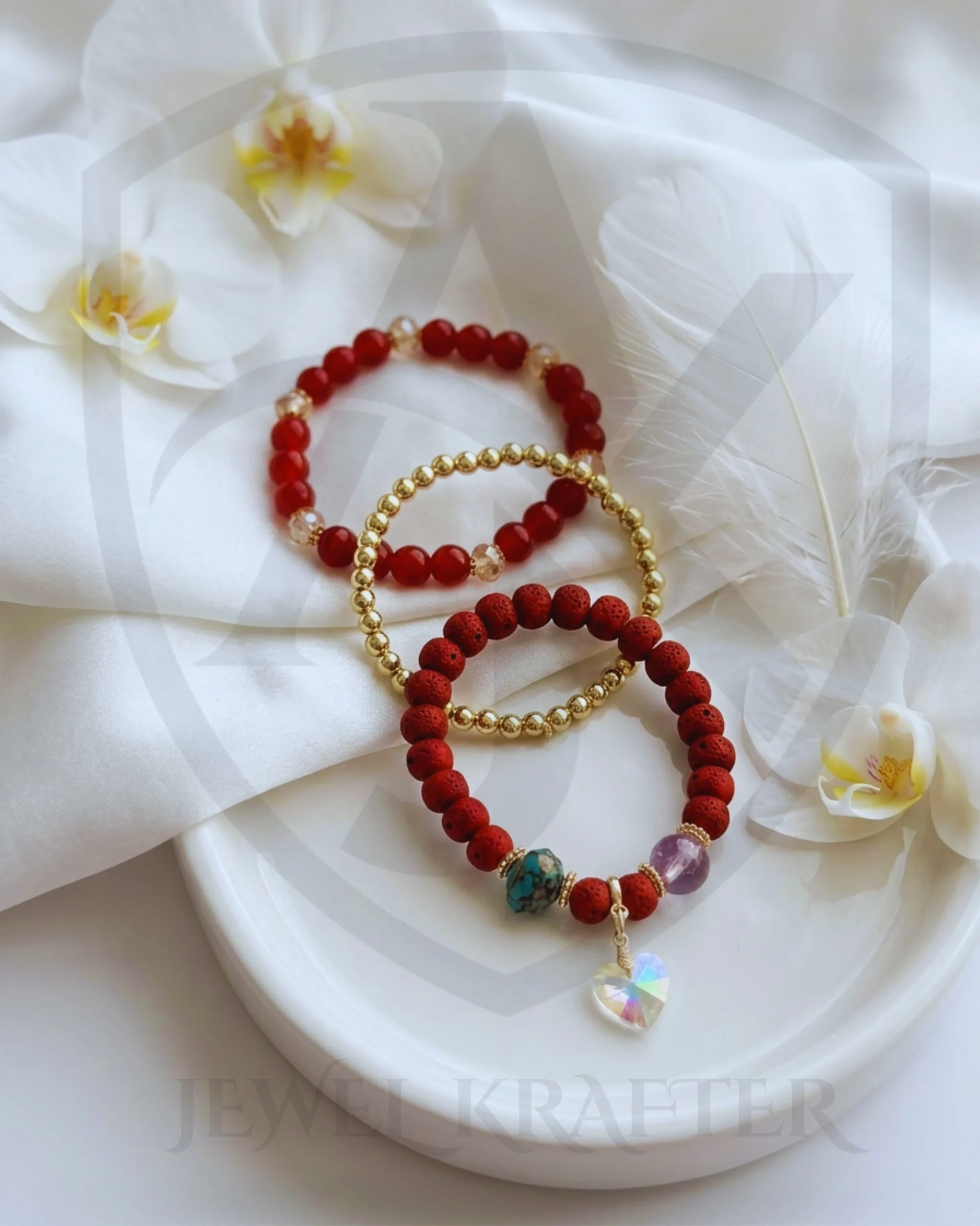 A striking trio featuring red lava stone beads with a heart charm and gemstone accents, paired with a sleek gold beaded bracelet and a crystal detailed red strand for a bold, romantic stack.