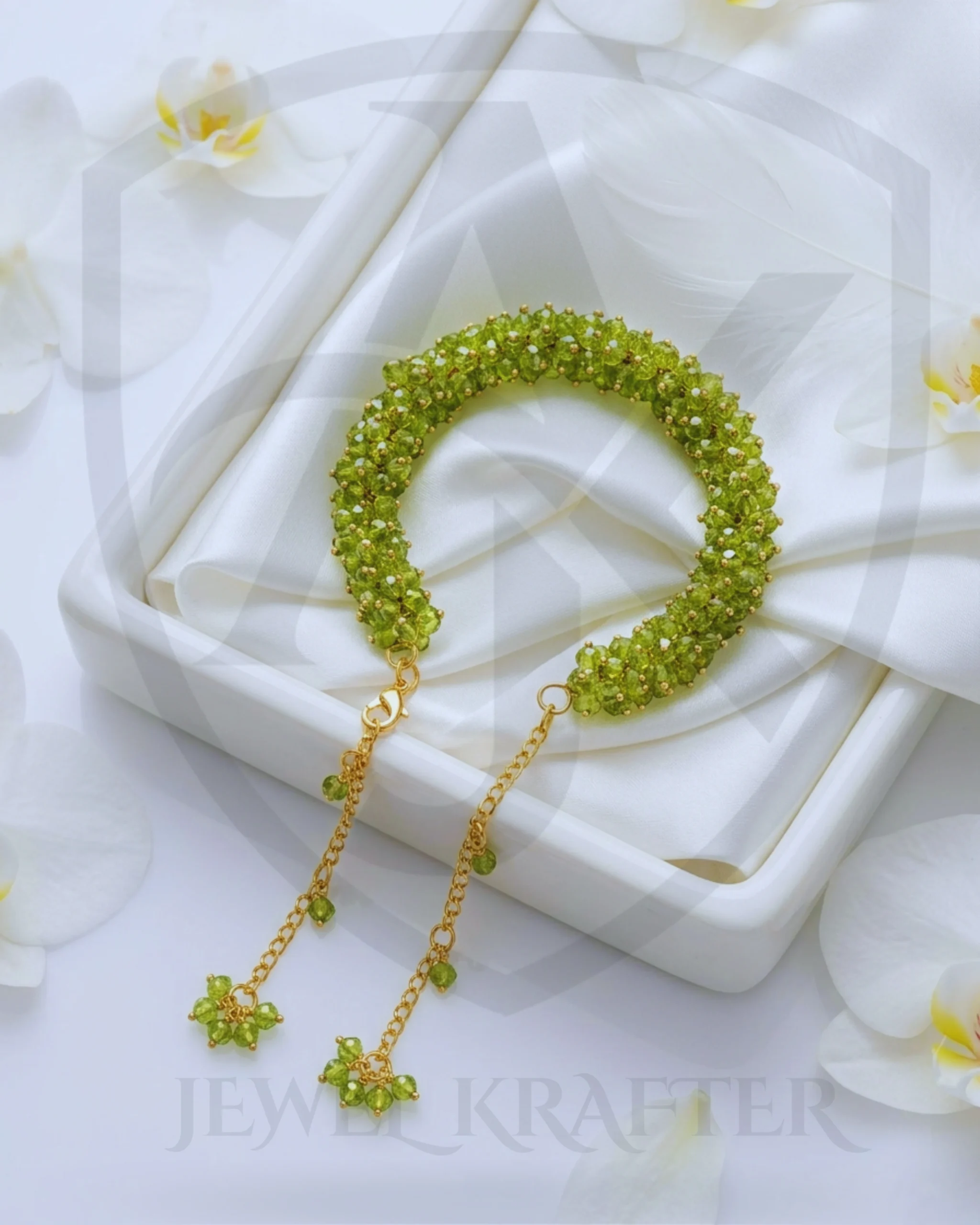A fresh, spring inspired bracelet woven with sparkling lime-green crystals and tiny gold beads, finished with long charm chains and floral drops that sway gracefully.