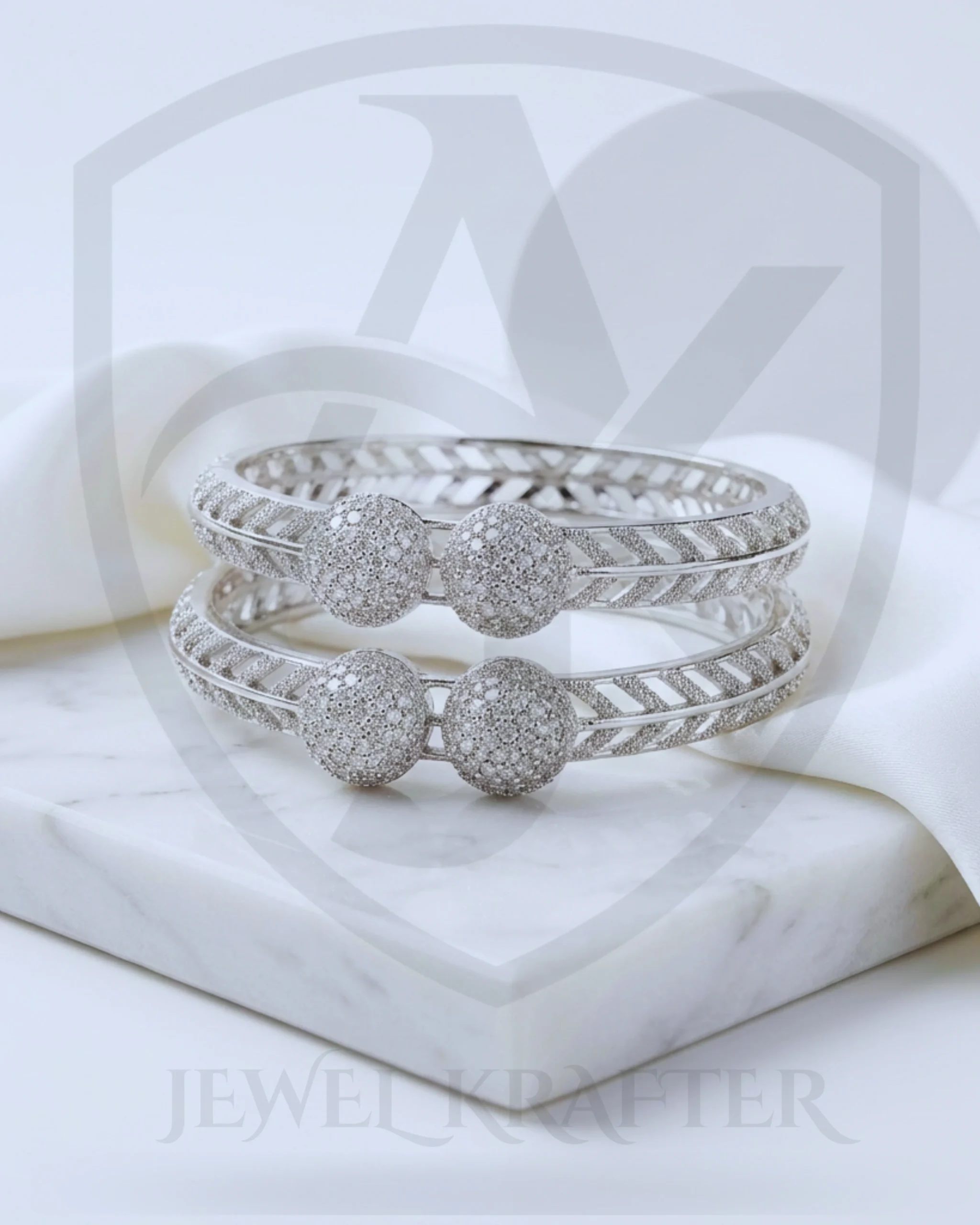 Crafted for those who shine effortlessly, this matching bangle duo features sparkling pave orbs and intricate arrow-cut lattice detailing in lustrous silver.