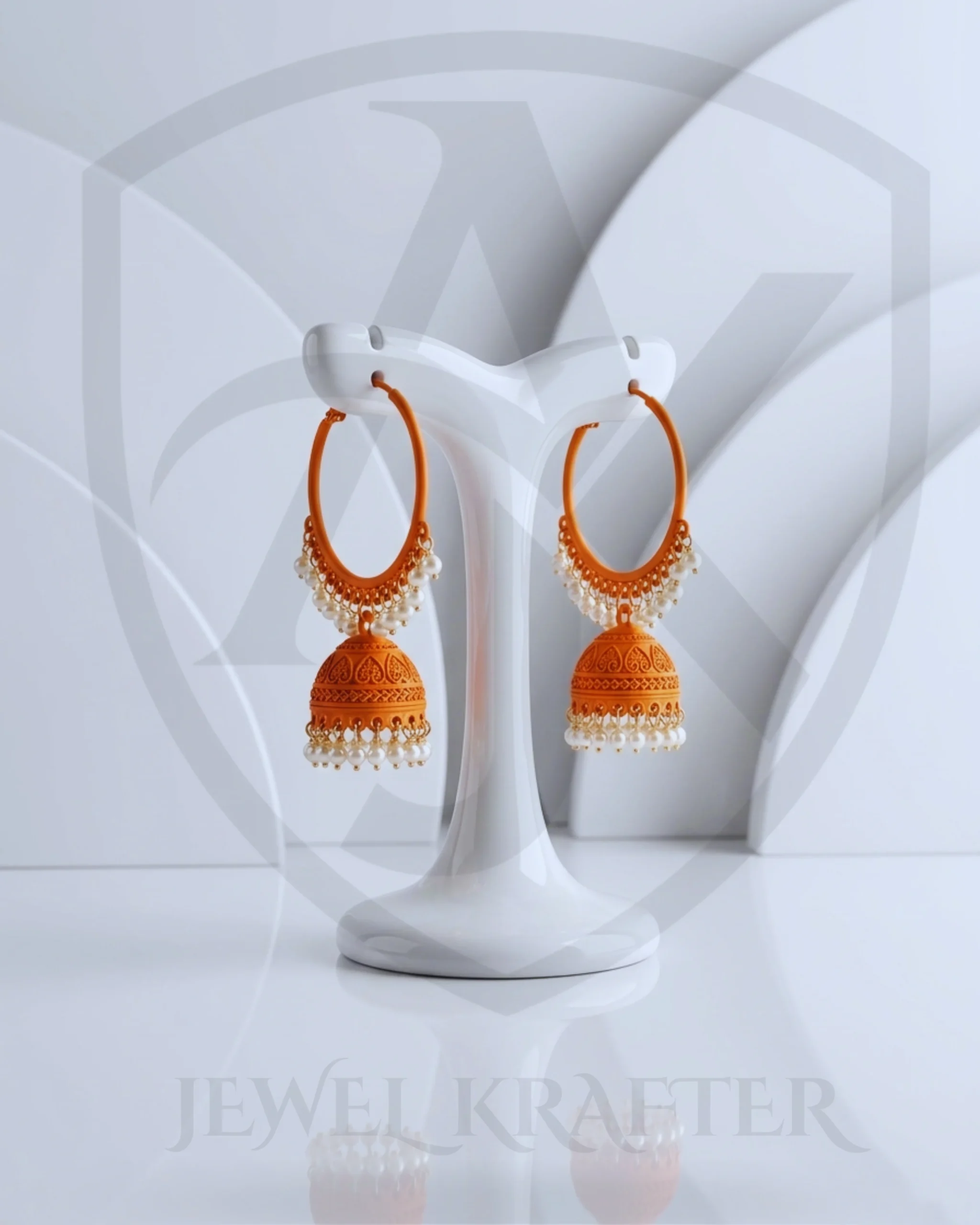 Marigold orange domes featuring intricate traditional patterns are paired with dainty pearl drops, perfect for mehndi, mayun and dholki events.