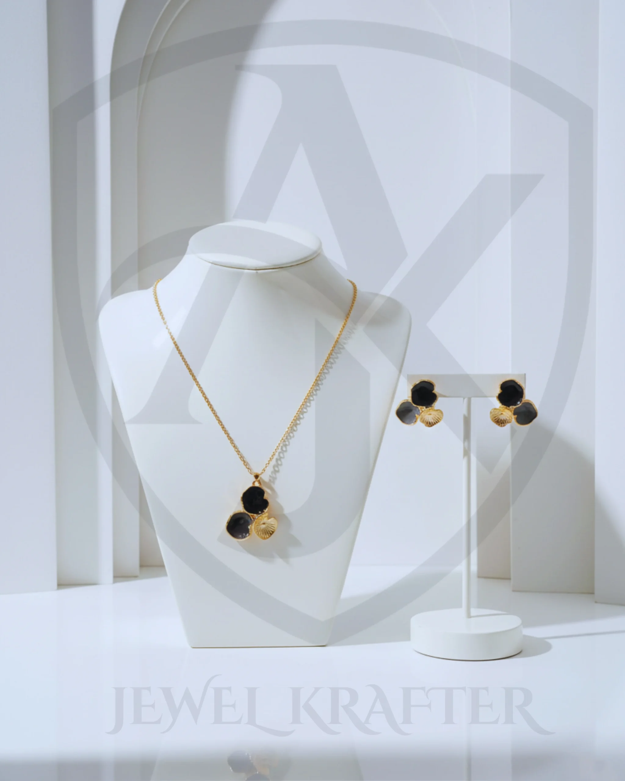 Deep black clover shaped stones framed in warm gold create a striking, modern contrast. This necklace and earring set brings instant sophistication to evening outfits and formal occasions.