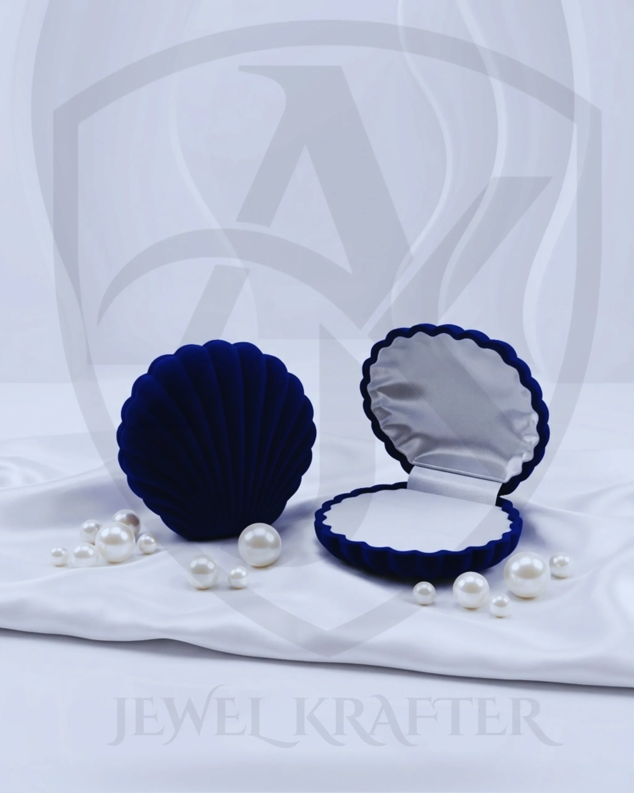 Ocean inspired navy blue shell shaped velvet box with a soft white insert, perfect for presenting both rings and earrings.