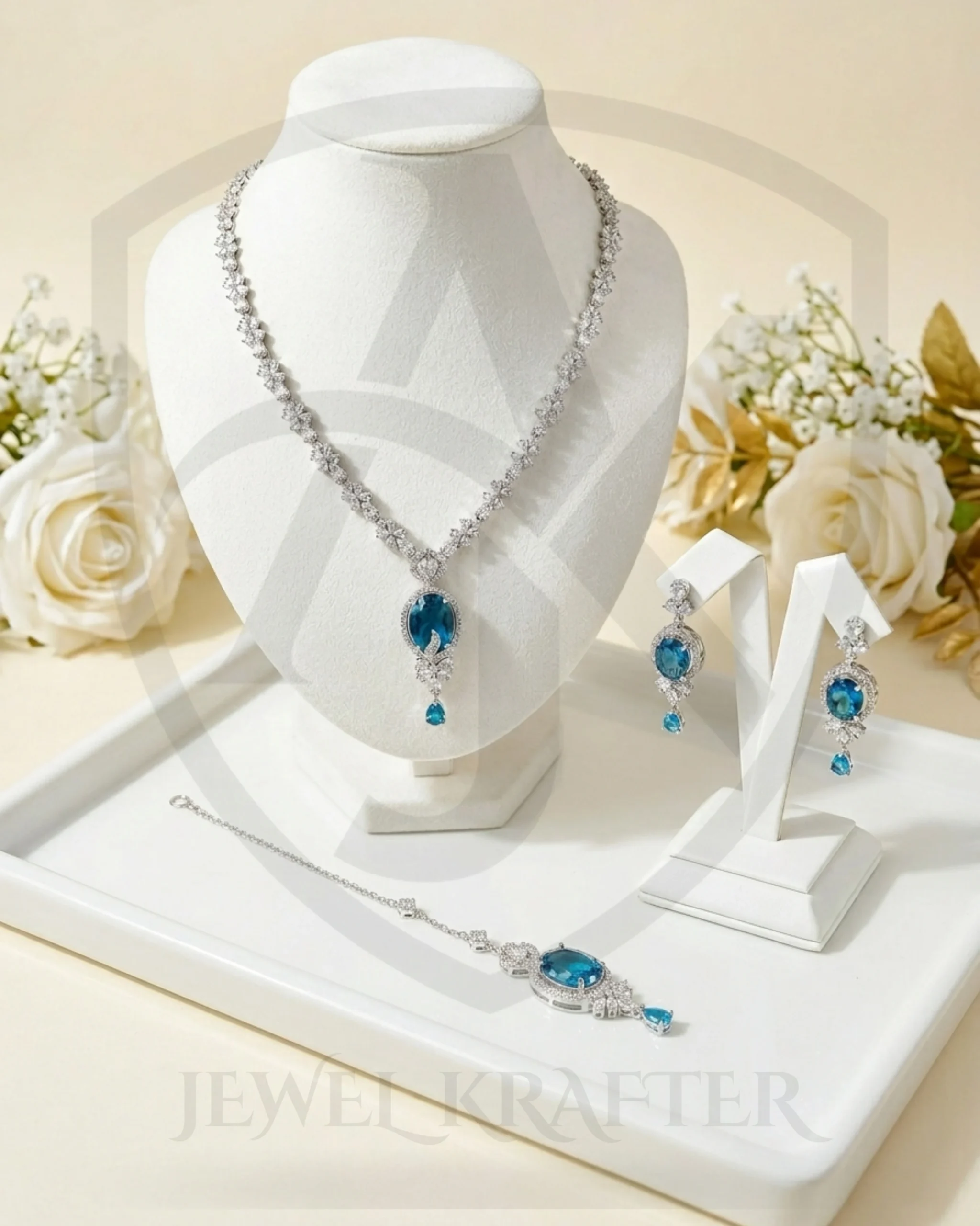 Inspired by the beauty of clear evening skies, this stunning set pairs brilliant blue centerpiece stones with finely set crystal accents. The balanced design offers glamour without overpowering, perfect for engagement parties, formal galas, or festive occasions.