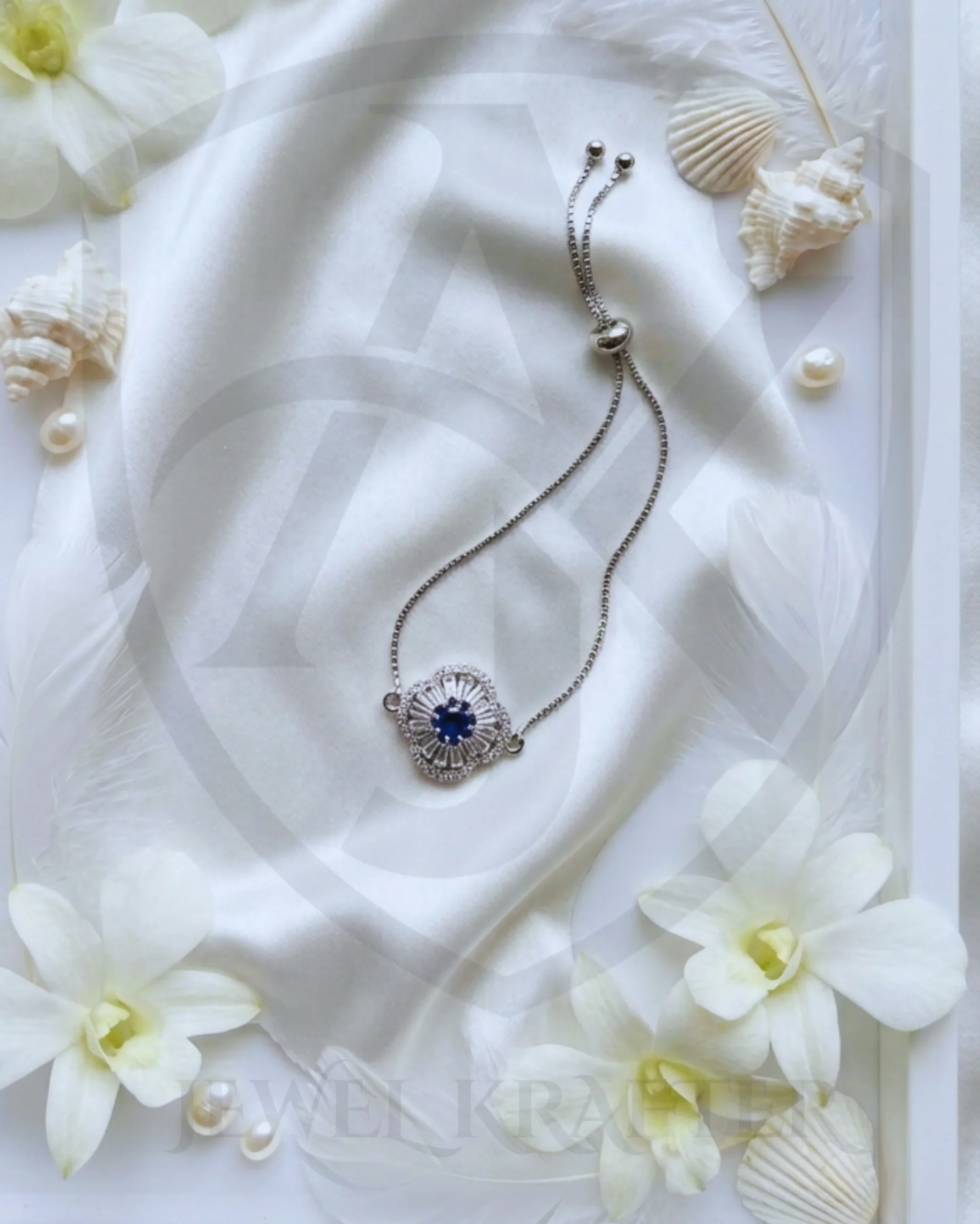 This sleek bracelet showcases a rich blue solitaire embraced by a radiant crystal halo, set on a fine adjustable chain for a perfect, comfortable fit.