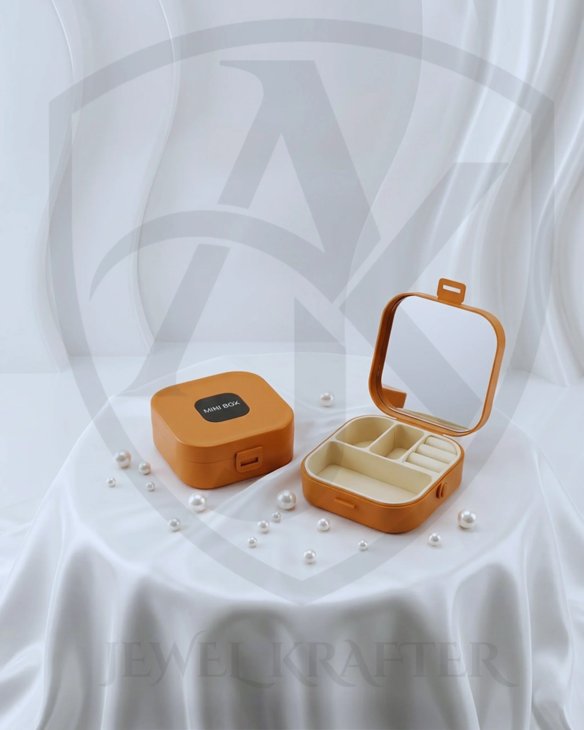 Compact orange square mini box with built in mirror and cream compartments, perfect for organizing rings, earrings, and tiny accessories.
