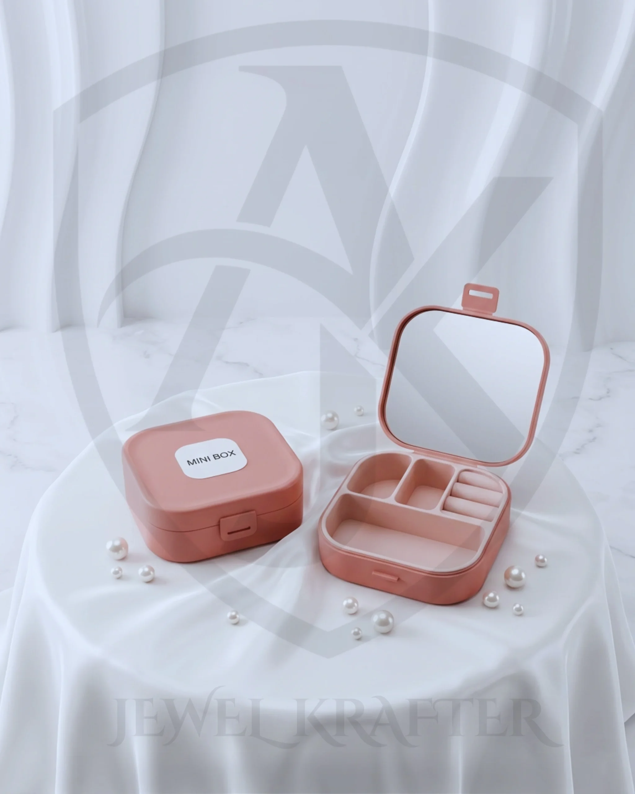 Elegant peach square mini box with built in mirror and multiple compartments, perfect for organizing rings, earrings, and small accessories.