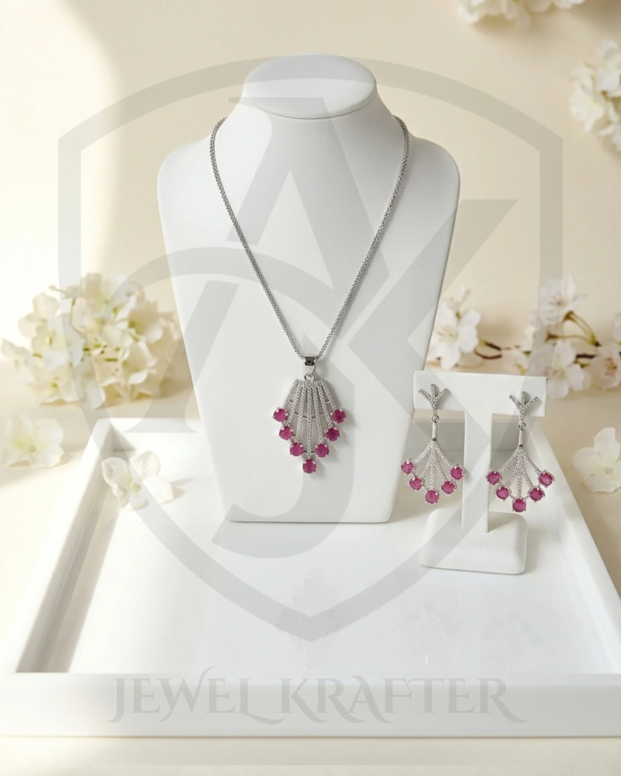 Inspired by blooming petals, this beautifully crafted pendant and earring set highlights vivid pink gemstones suspended within a sparkling silver framework.