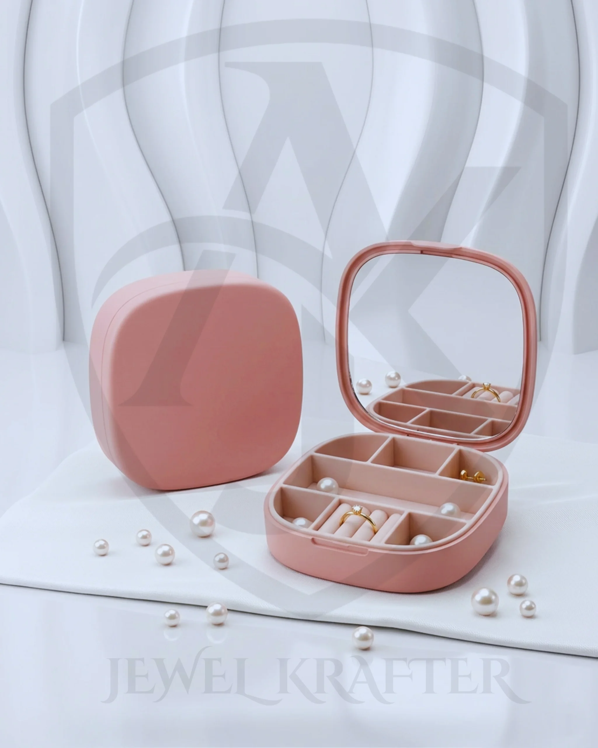 Elegant pink square mini box with a full mirror and multiple compartments, perfect for neatly storing rings, earrings, and delicate accessories.