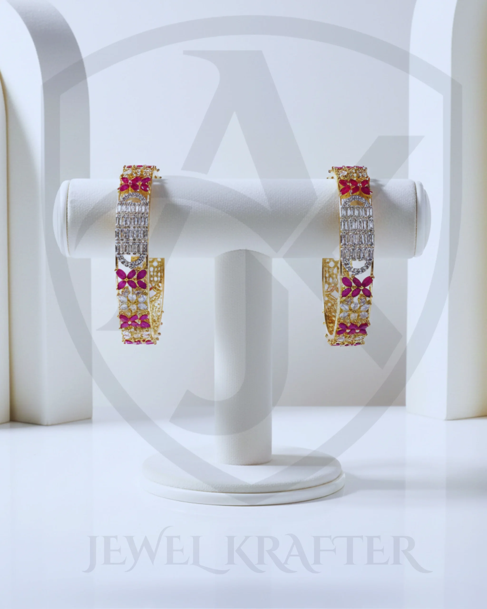 These beautifully crafted bangles feature sparkling diamond patterns with vibrant ruby floral designs. A luxurious piece that enhances both modern and traditional looks.