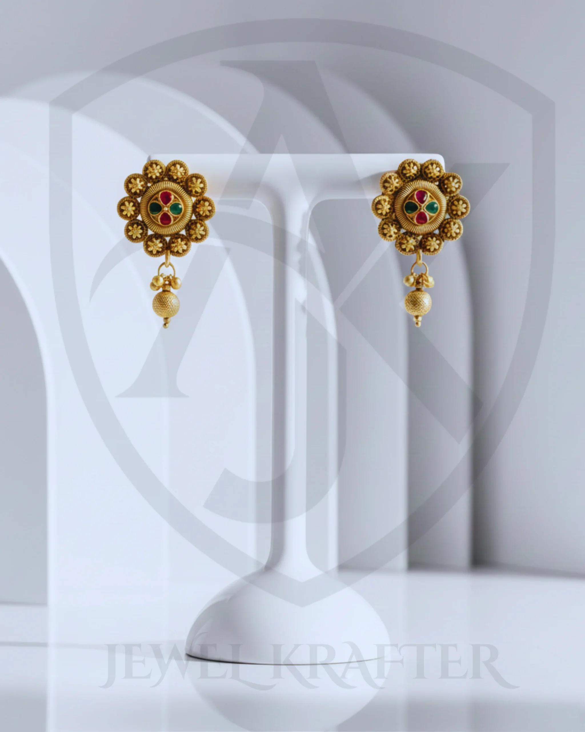 Rajasthani inspired floral studs in antique gold, highlighted with red and green enamel and a textured gold drop for graceful movement.