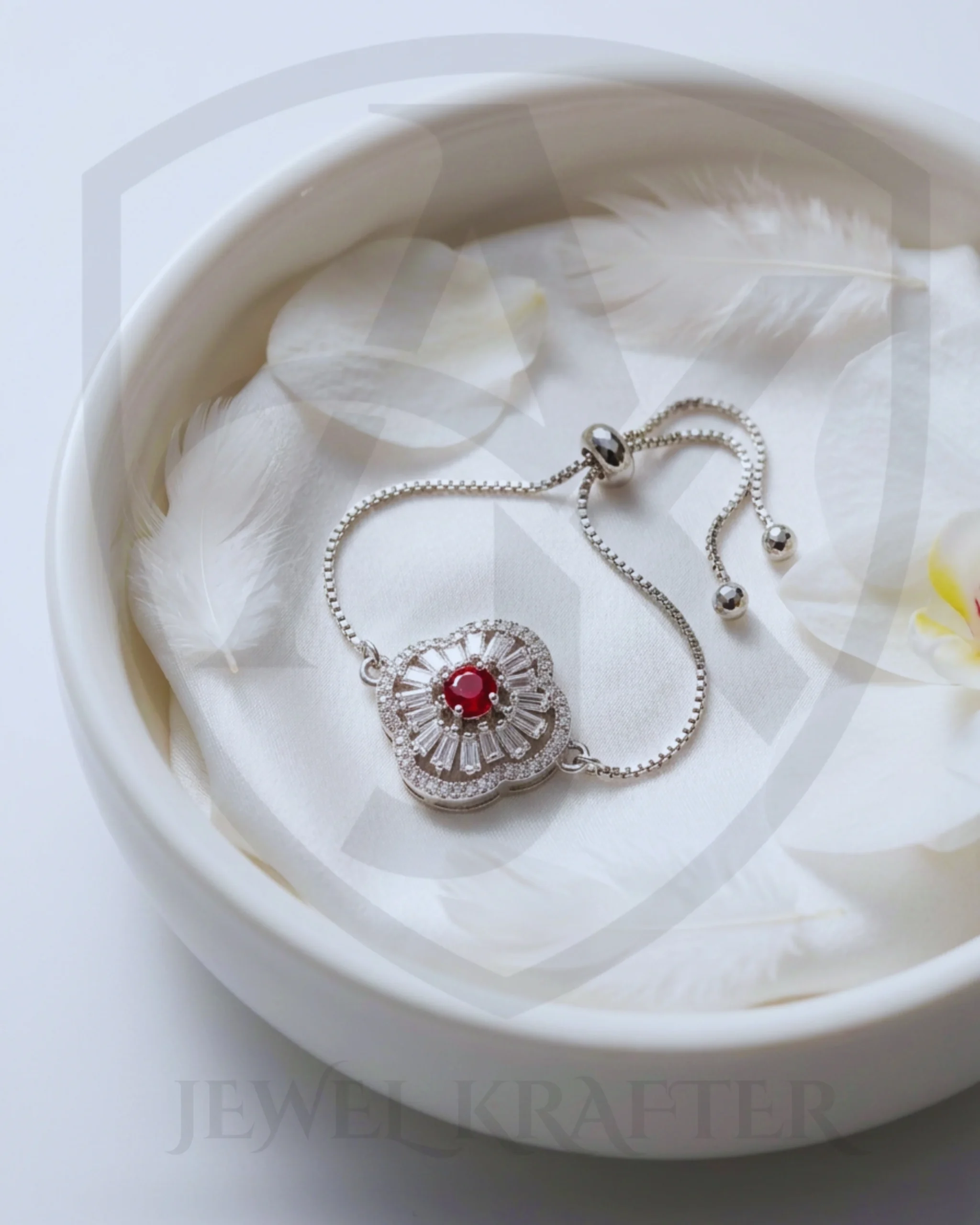 Featuring a bold crimson stone encircled by a halo of baguette and micro crystals, this adjustable silver bracelet is a statement piece perfect for gifting or bridal trousseau.