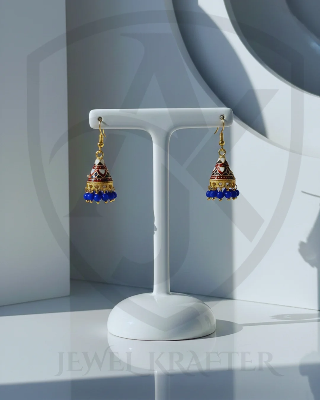 Delicate gold‑tone mini jhumkas featuring traditional red and green meenakari work, finished with clustered blue beads for a festive desi touch.