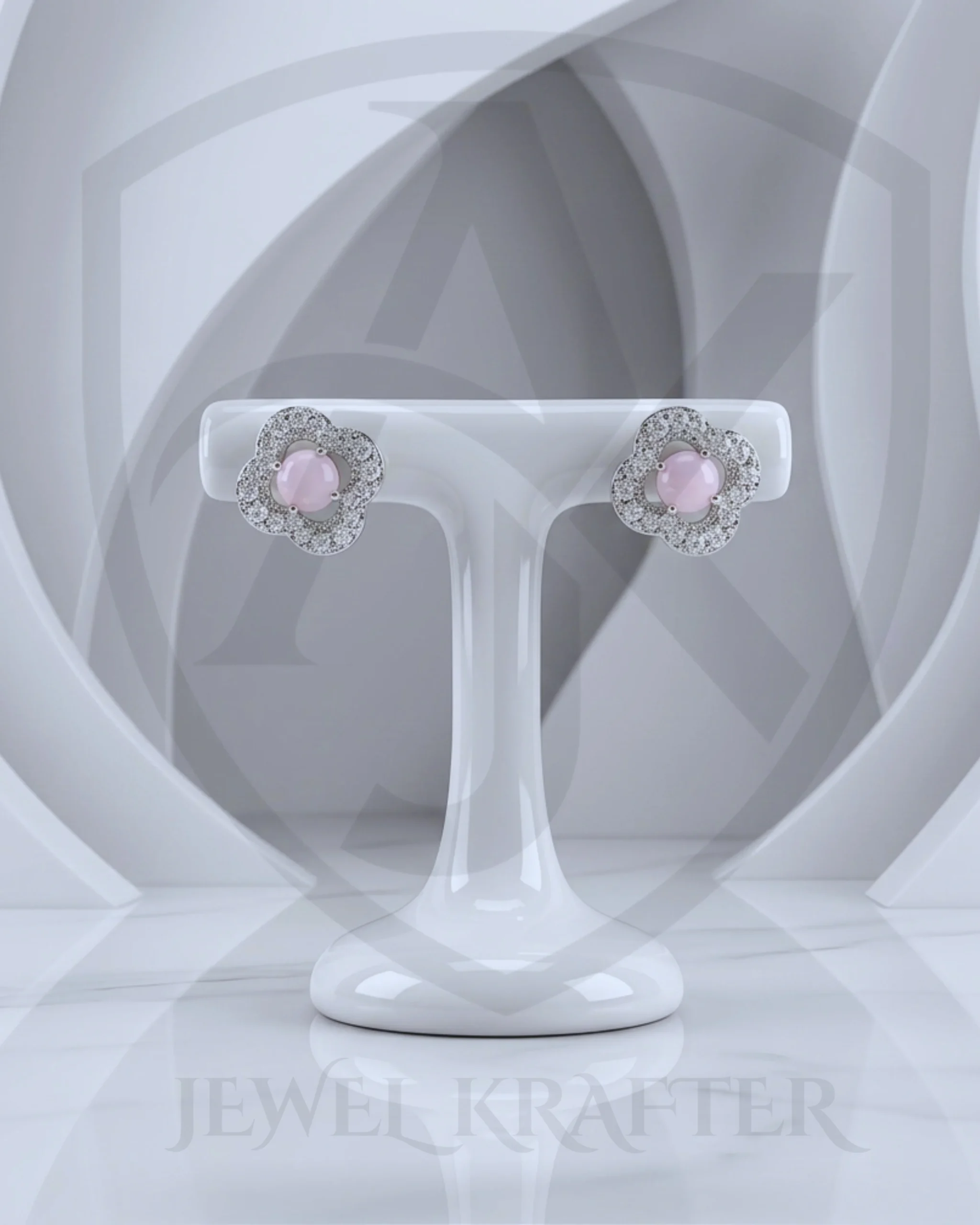 Elegant earrings with a misty pink stone at the heart of a glittering flower shaped halo, ideal for bridesmaids or daily wear.