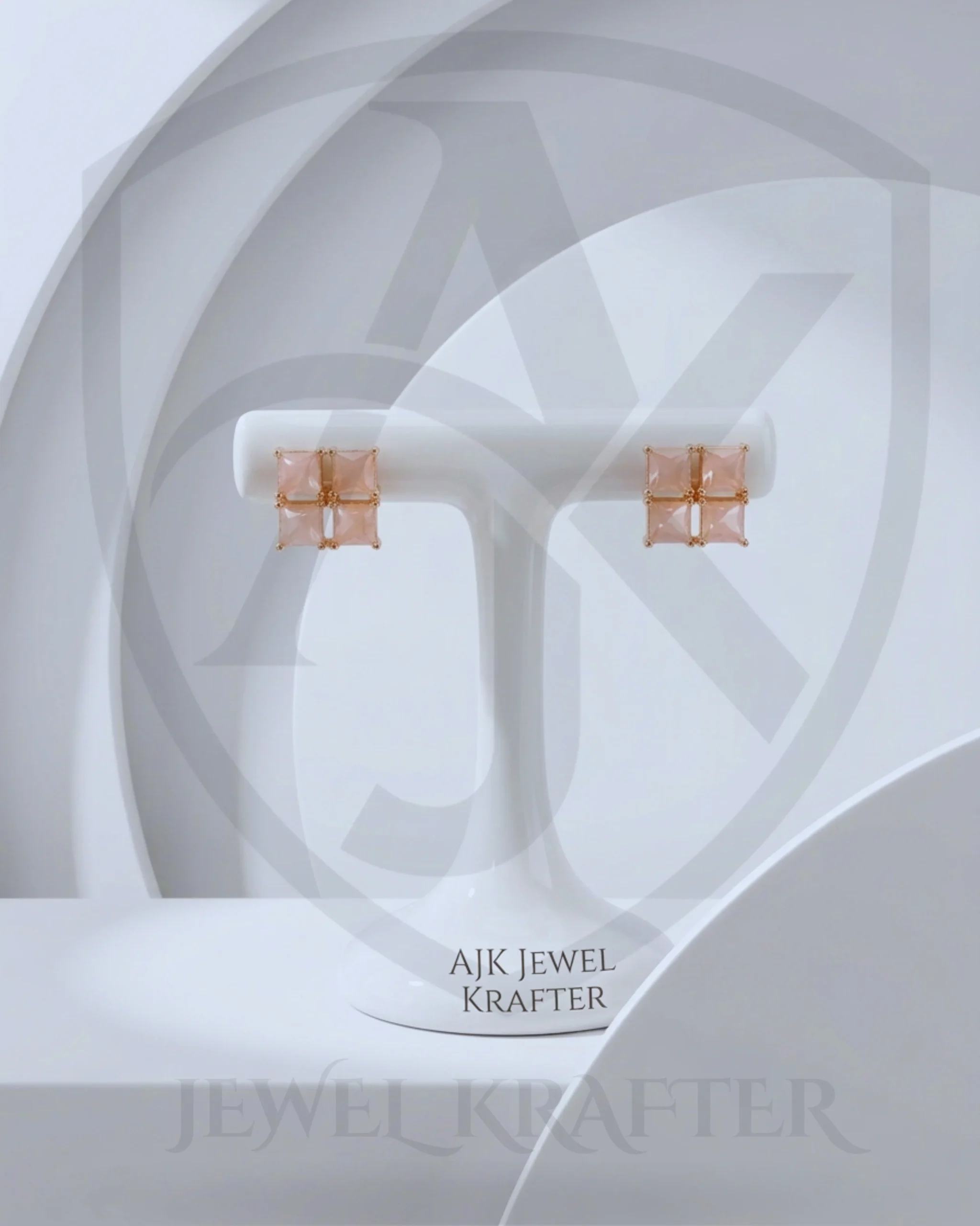 Dainty earrings with nude pink princess cut stones arranged in a neat quad, framed by delicate gold prongs for a subtle, polished look.