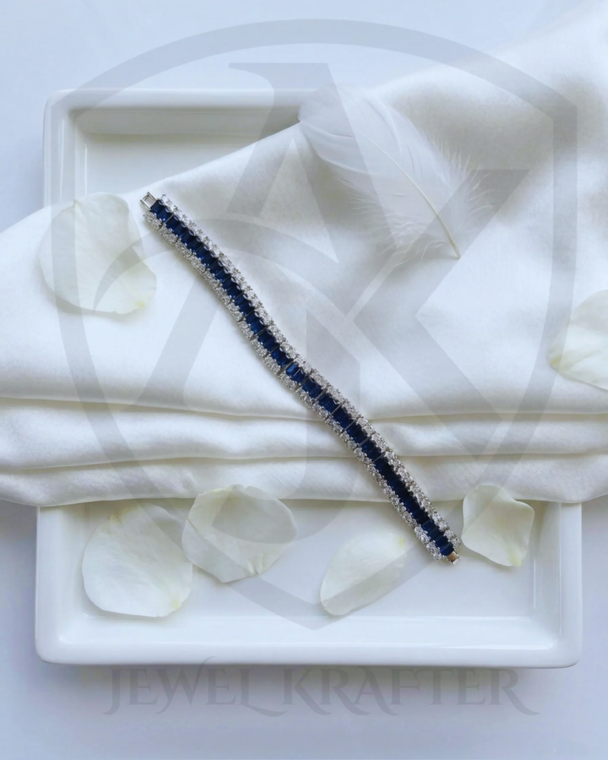 Alternating sapphire hued bars are bordered by twin rows of icy CZ, giving this sleek silver bracelet a regal, red carpet feel perfect for weddings and formal events.