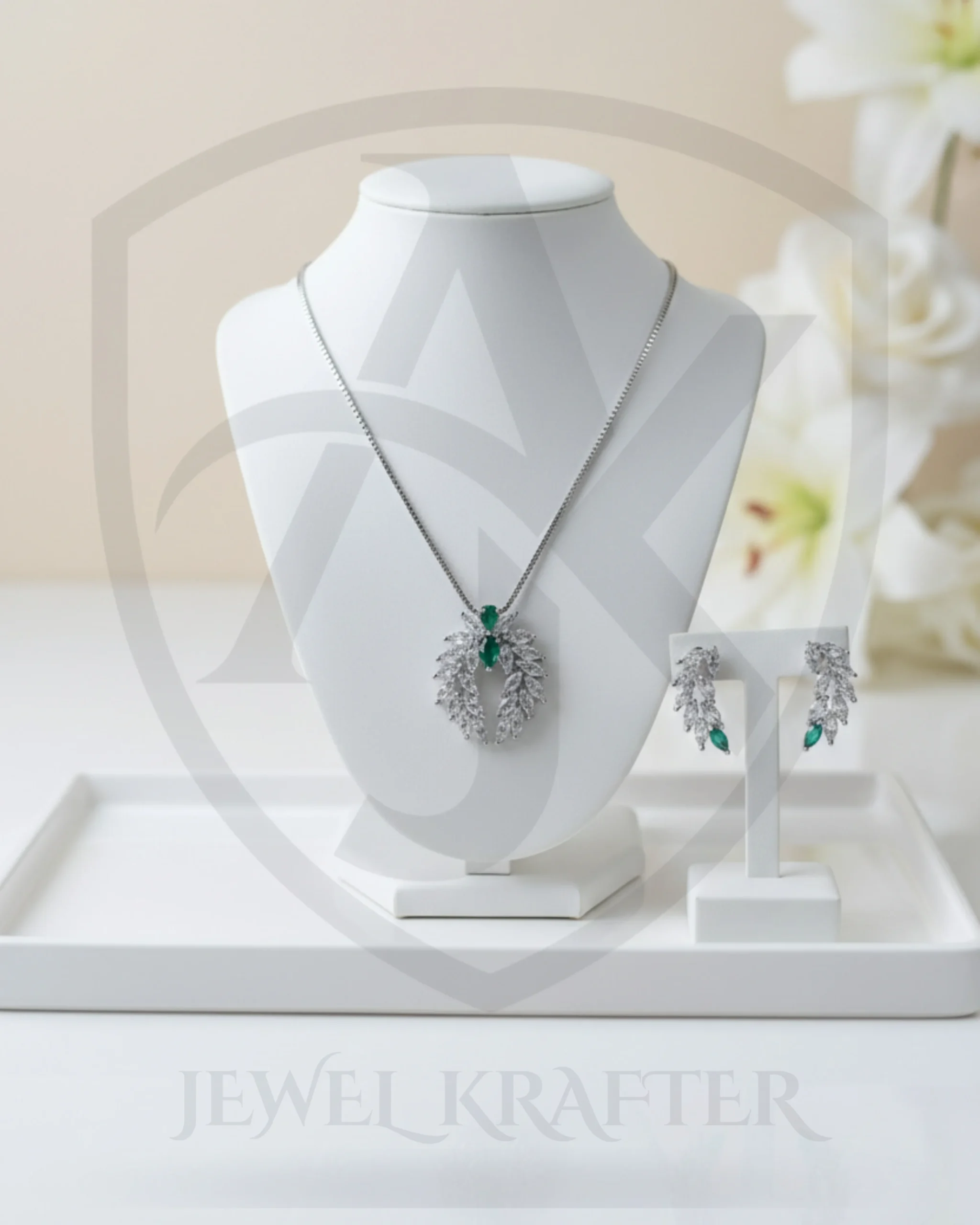 Perfect for weddings and parties, this pendant and earring set shines with timeless sophistication. This silver and emerald set adds a touch of royal elegance to any formal look.